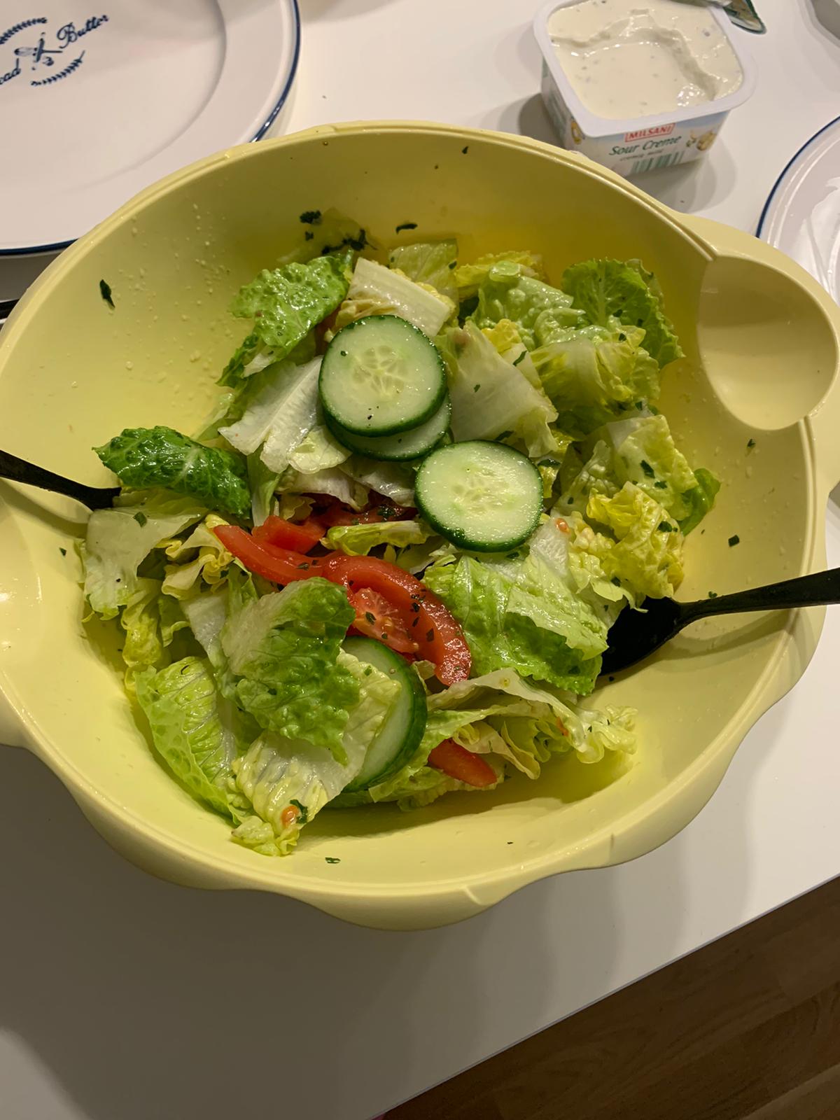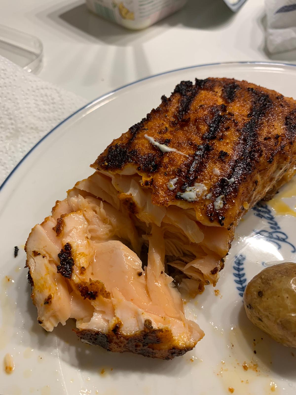 BBQ Lachs mit Ofendrillingen, Sour Cream und Salätchen. Fürs anrichten gehe ich mal bei mossoma ins Training, geschmacklich war es perfekt hätte aber 2 Min früher von der Flamme können.