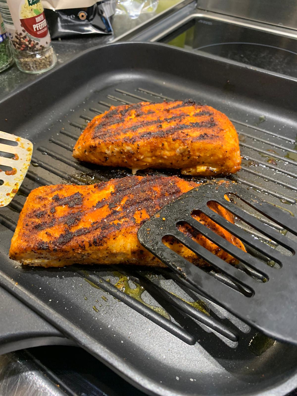 Optisch sieht der Gargrad des Lachs für mich perfekt ausBei mir ist's auch mal wieder soweit, also nicht mit kochen, sondern mit Bildern zeigen, weil es sooo gut geschmeckt hat.