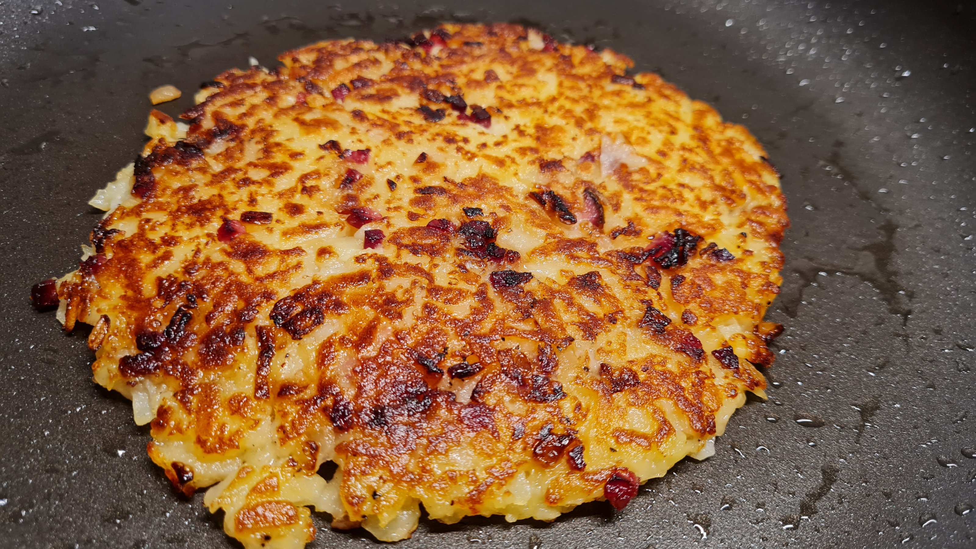 Hört sich gut an, würde mir sicher auch schmecken!Das ist ein altes Bauerngericht. Gekochte Kartoffeln werden (kalt) gerieben, beidseitig in Schmalz angebraten und mit Salz und Pfeffer gewürzt.