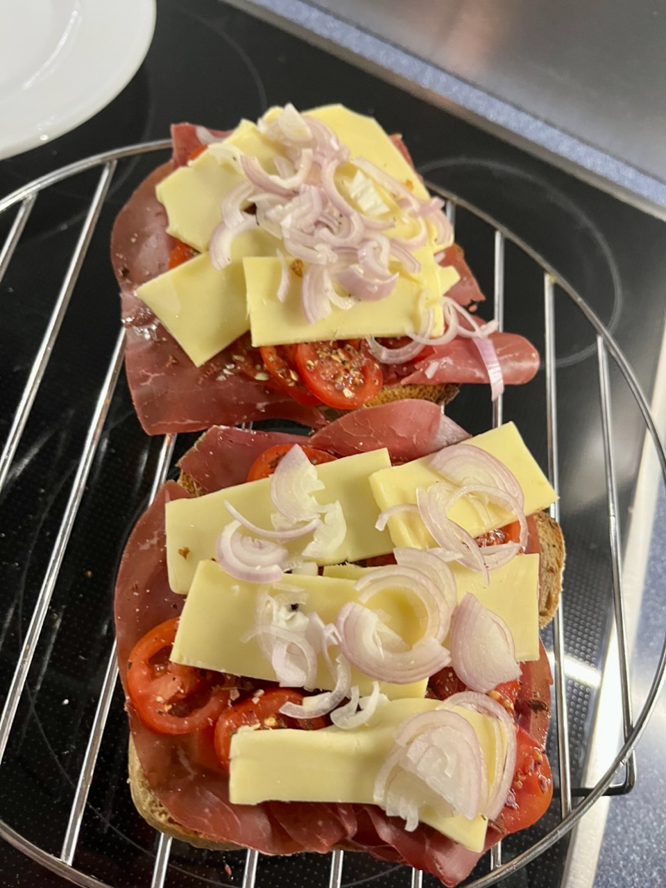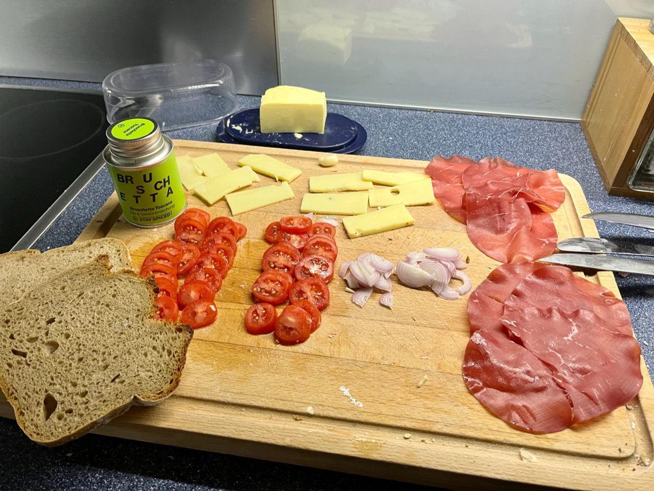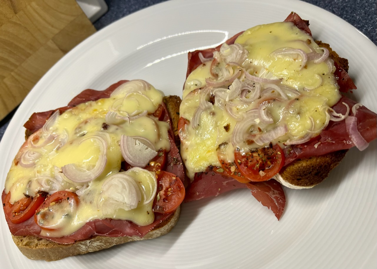 Dinkel-Roggenbrot getoastet, mit Knoblauch abgerieben, Butter gestrichen, Bresaola (statt Salami), Tomaten, Bruschetta Gewürz, Raclette (Höhle Kaltbach), Schalotten und ab ein paar Minuten auf die Grill Oberhitze.