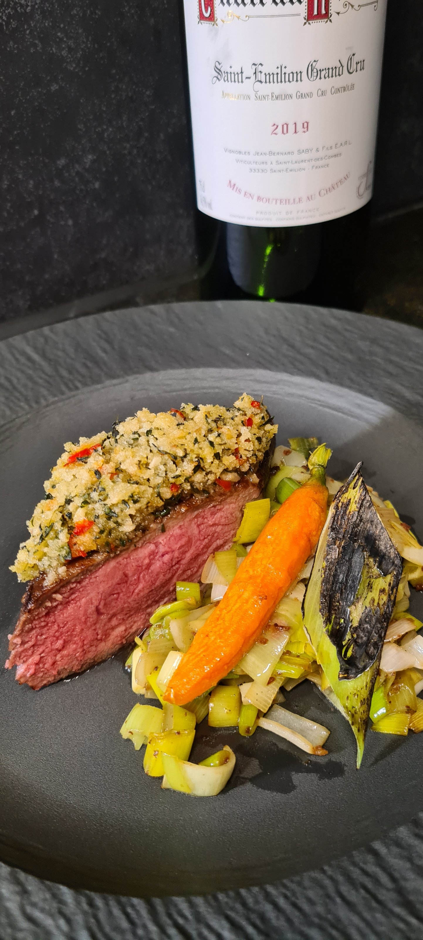 Rostbraten mit Zwiebeln, glasierter Möhre, gebranntem Lauch.