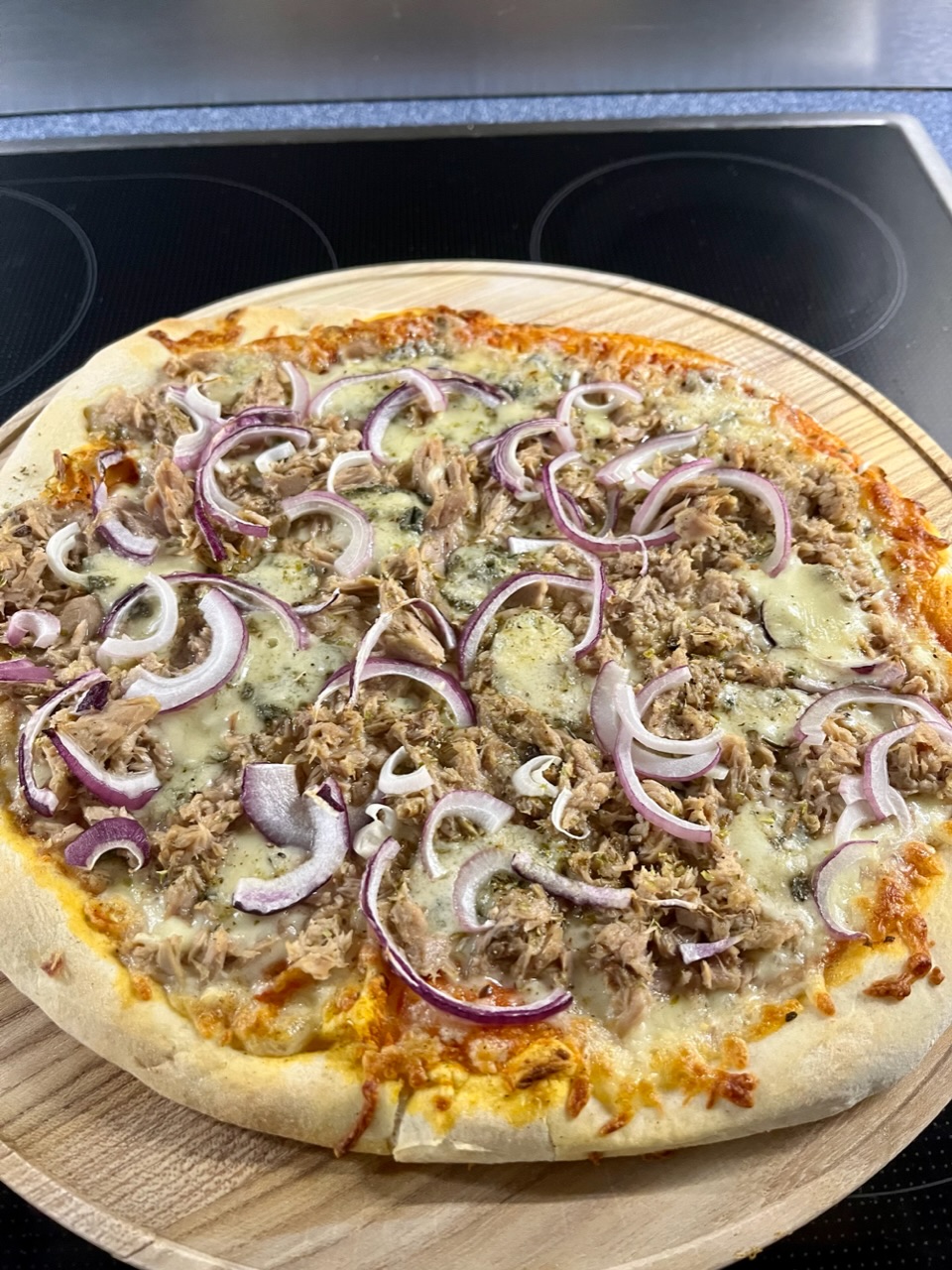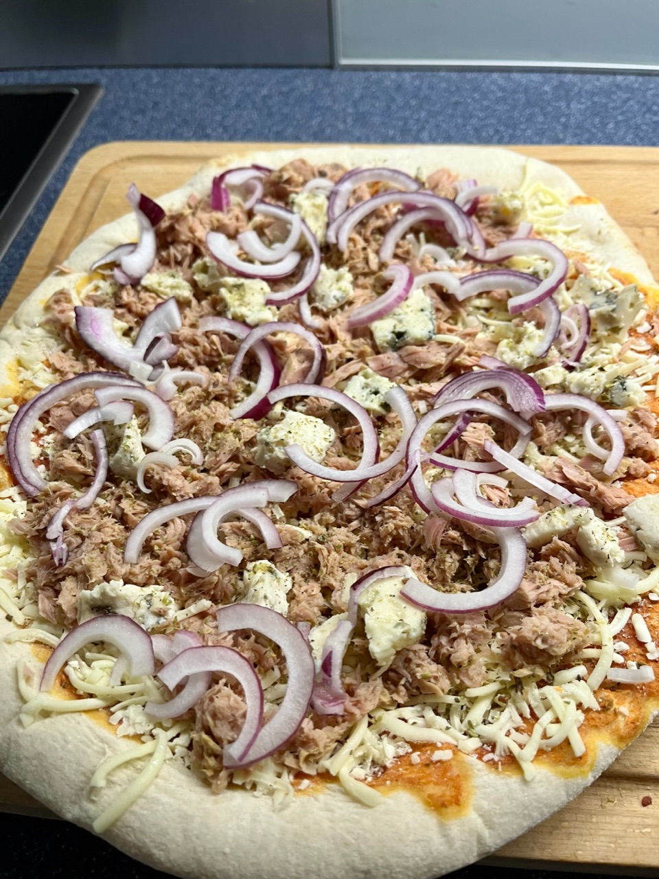 Piazza mit Thunfisch, Roquefort, Zwiebel, Gewürze.