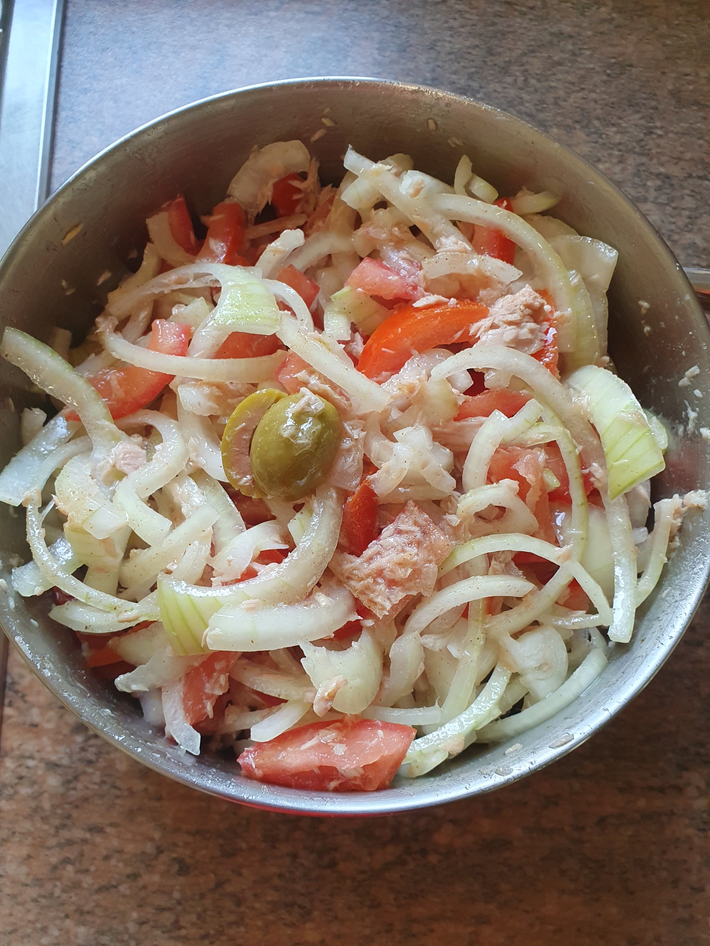 Man nennt es auch "Salat"Eine weitere 4 ☆ Delikatesse für heiße Tage anstelle von Chips vor dem Fernseher. Tomate, Zwiebel, Thunfisch, Oliven. Salatöl, Essig und Selleriesalz.