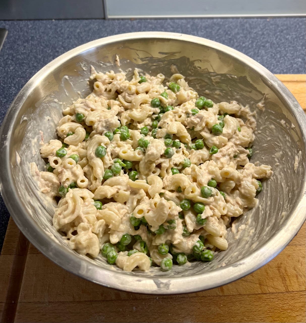 Das ist eine Spezialmischung mit Thunfisch, Erbsen, Majo, Sauerrahm, Creme Fraiche und Pfeffer.