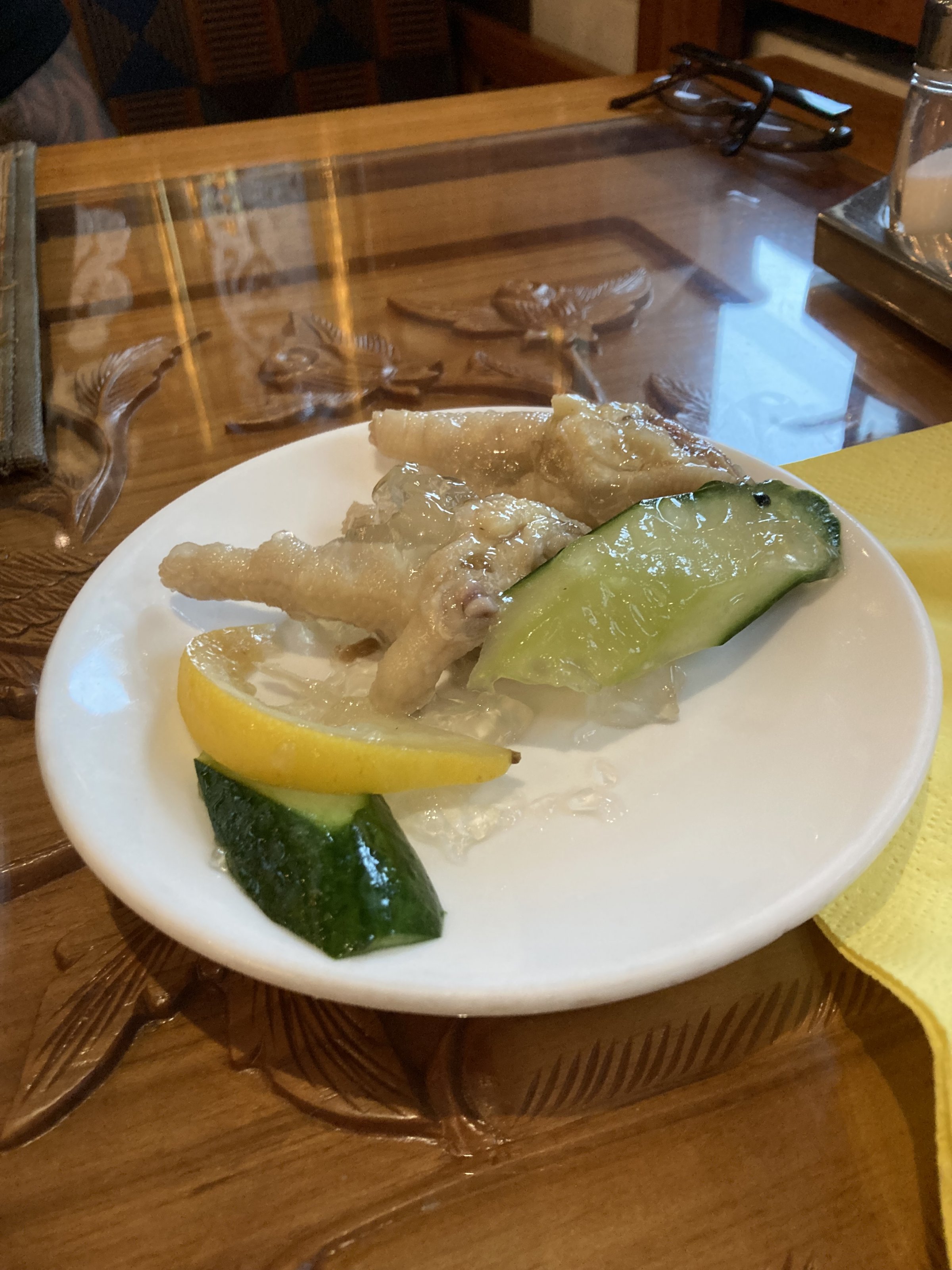 Hühnerfüsse, keine Hähnchenschenkel, in scharfem, saurem Gelee, kalt serviert.
