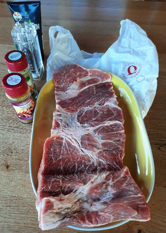 Dafür habe ich heute beim Metzger hier am See vorbei geschaut, und habe mir 1,4 Kg Schweinehals aufschneiden lassen: