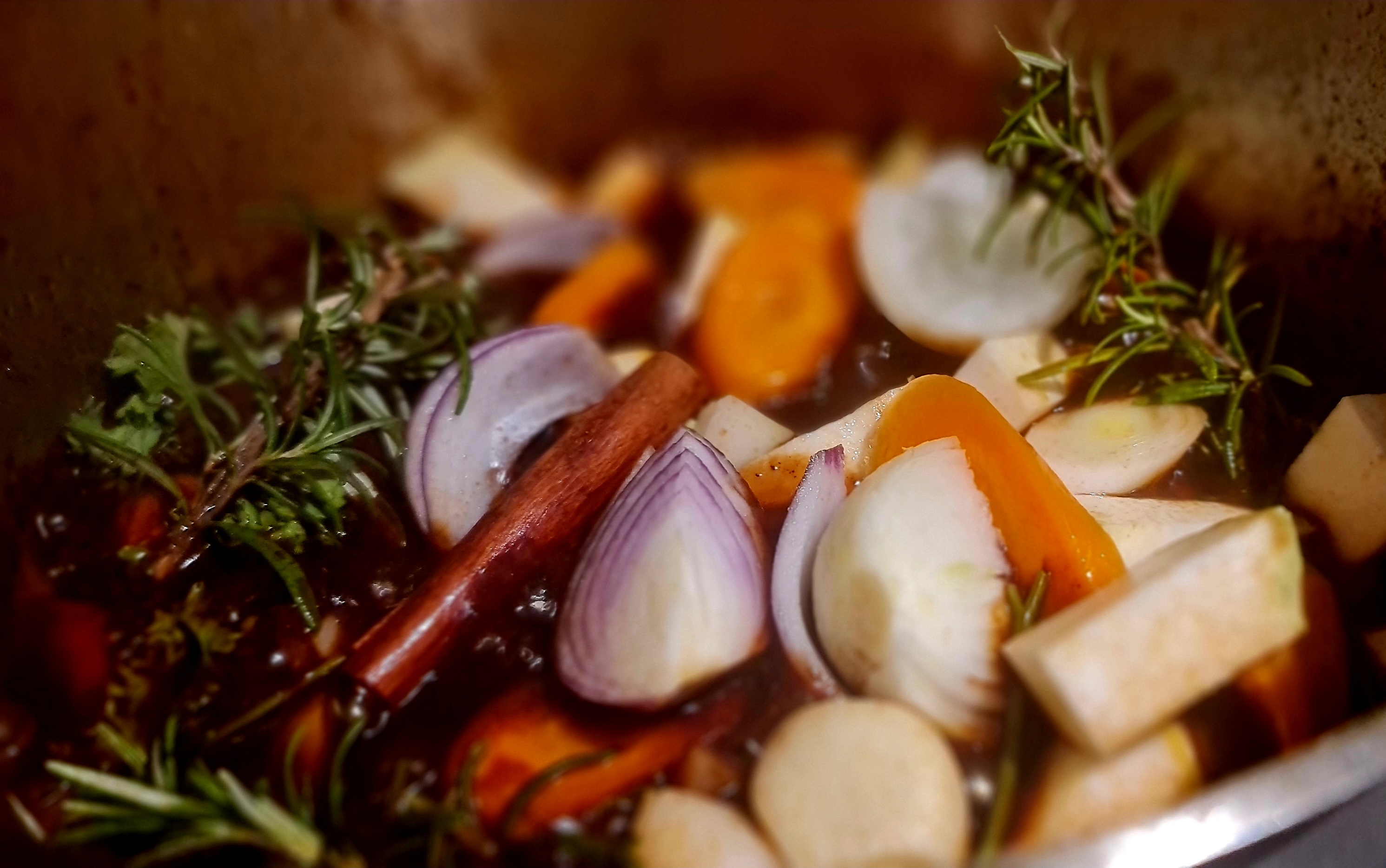 Gemüse für die Grundlage: Zwiebeln, Sellerie, Lauch, Karotten, Kartoffeln, Apfel. Alles in grobe Stücke und so viel, das der Grund des Bräter gut bedeckt ist.
