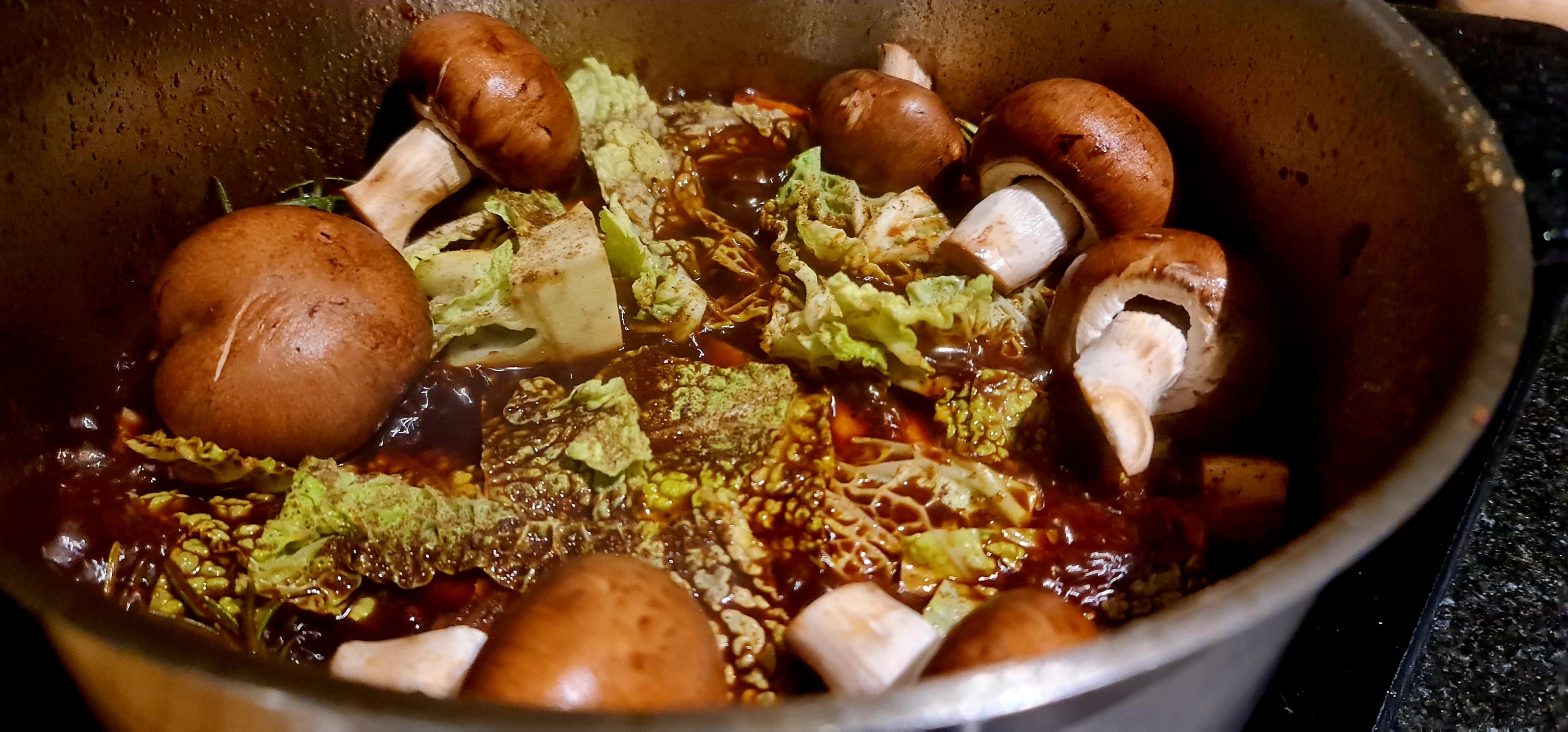 Deckel drauf und im Backofen für knapp 3 Stunden bei 180° Umluft ziehen lassen.