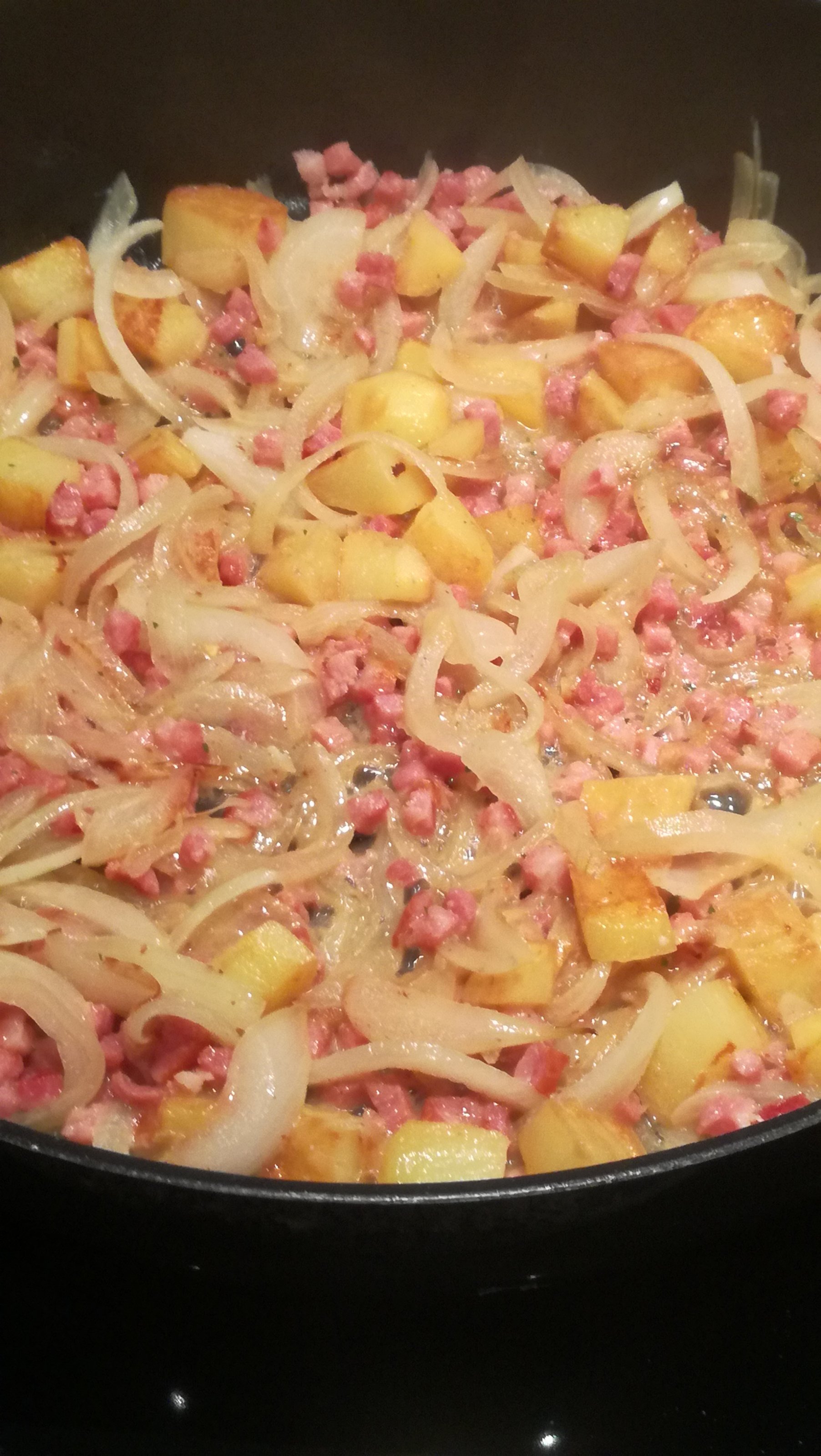 Ordentlich Speck und Zwiebeln dazu und schon mal etwas würzen.
