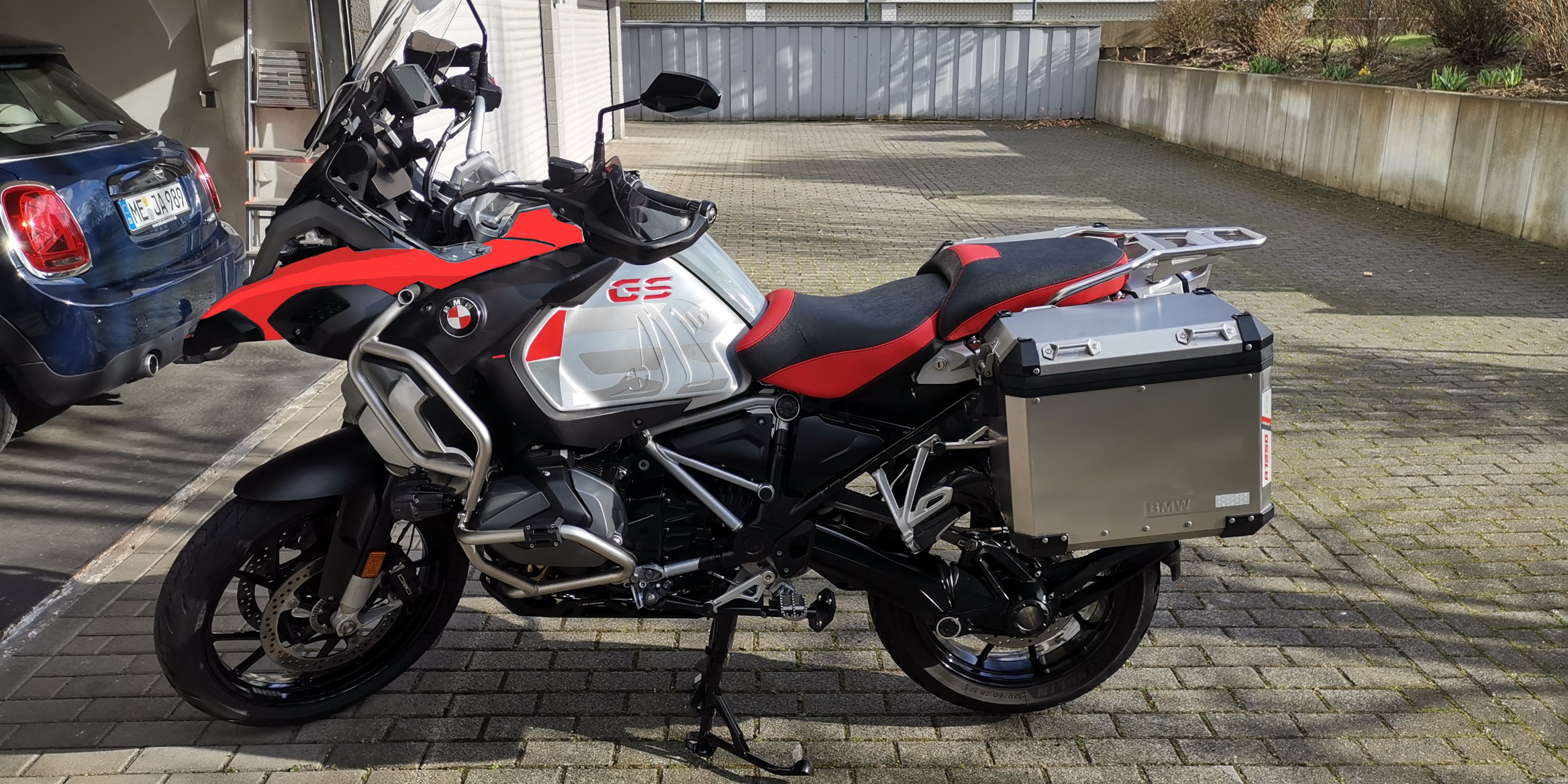 Oder?: Tja. Ich nehme für diese beiden Teile eine andere "Kontrastfarbe" Z.b. das Rot der Sitzbank oder der Aufkleber? Oder was ganz anderes? Schwarz? (bei Rot, käme dann natürlich kein R1250 Aufkleber mehr drauf
