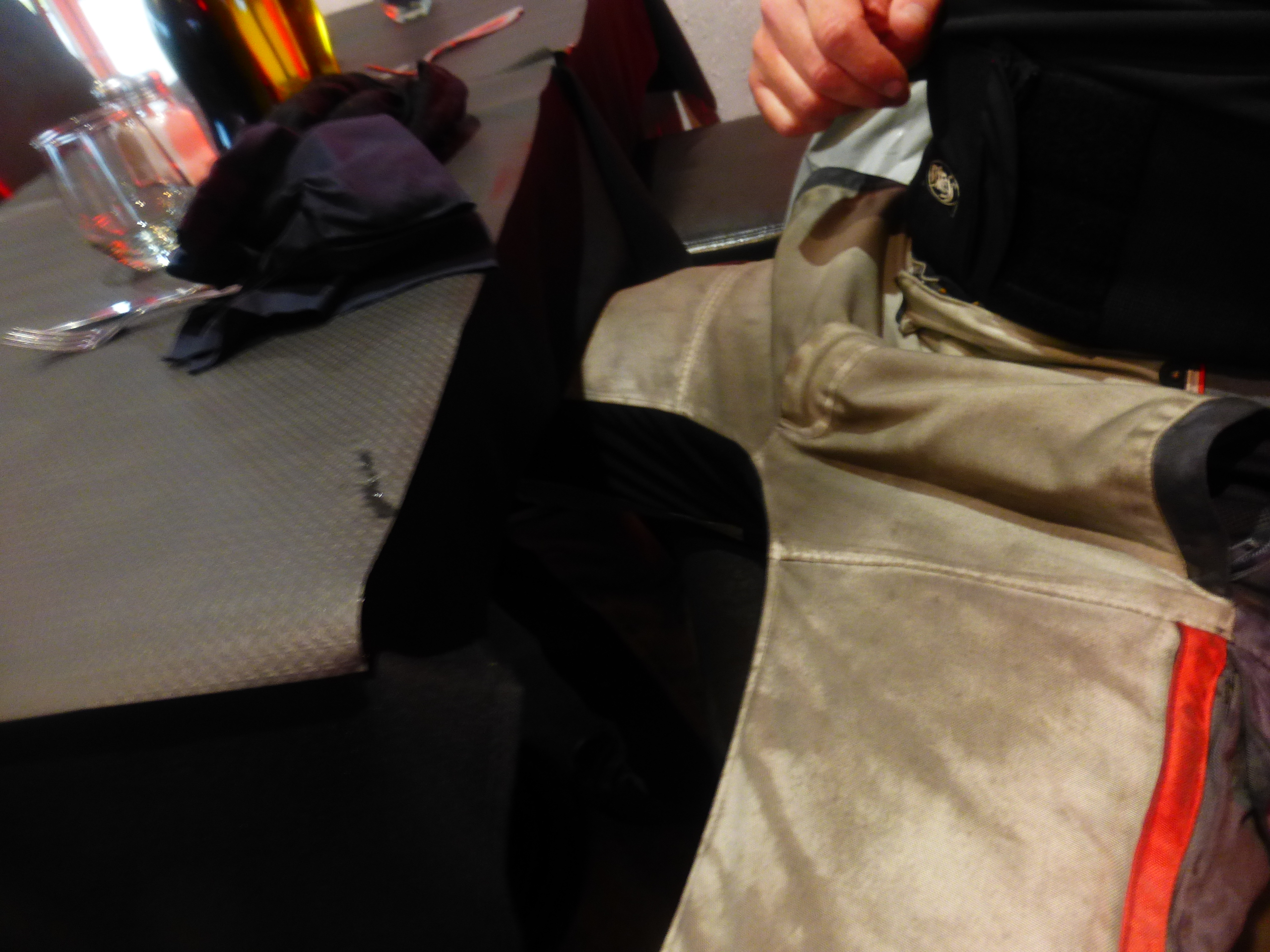 Zuerst fiel mir auf, dass die Kombi innen nass wird - ich nehme an, aufgrund der Dampfdiffusionsdurchlässigkeit der Textilkombi (Held: Quattro-Tempi), kondesiert der Schweiß innen an der Regenkombi.