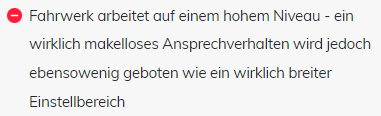 Hallo, Dein Beitrag speziell wegen des Ansprechverhaltens irritiert mich. Kannst Du nachvollziehbare Beispiele für "makelloses Ansprechverhalten" des Fahrwerks in Deinem Sinne geben ?Hallo zusammen