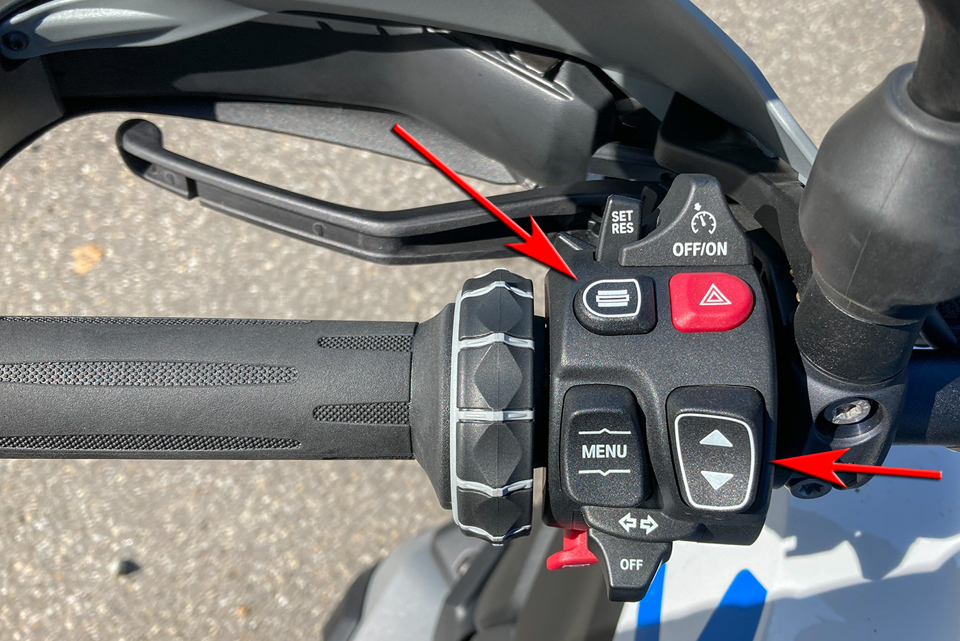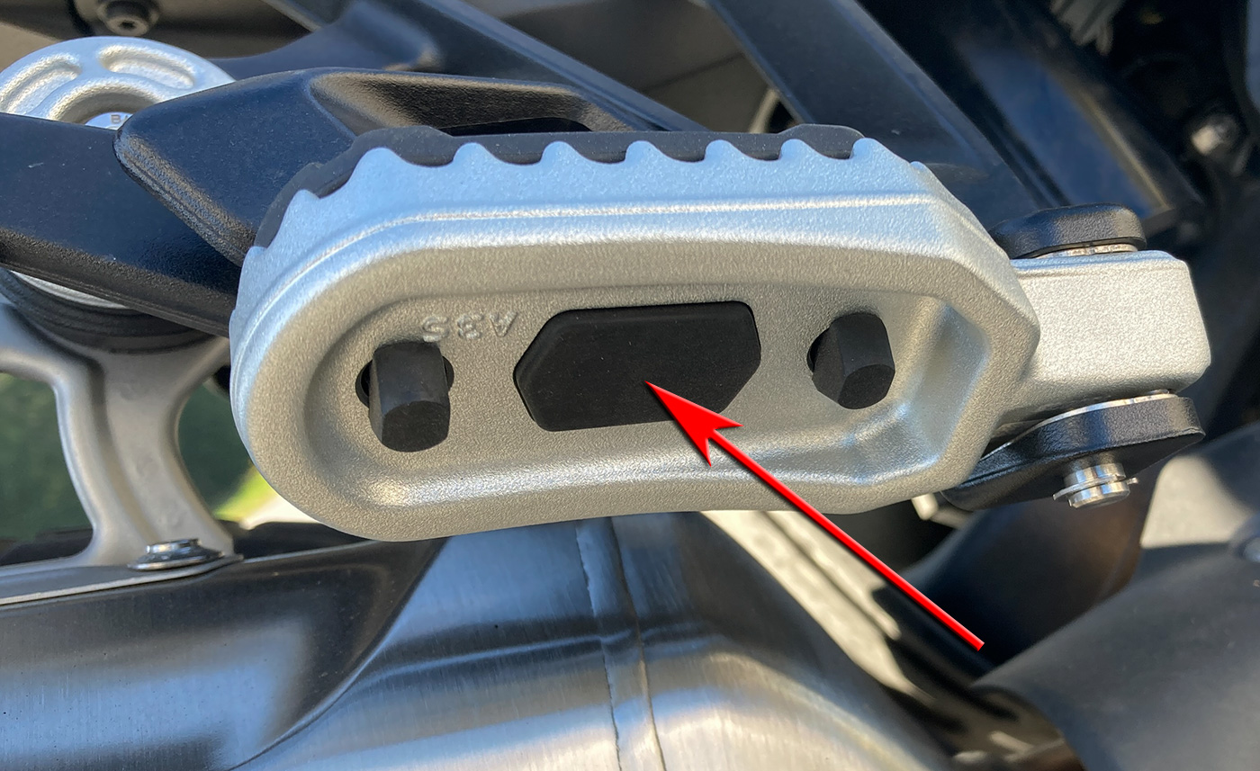 Links wo bislang das Tagfahrlicht aktiviert wird, befindete sich der Schalter für die "Multiwippe". Hiermit aktiviert man diverse Funktionen in einem Menü wie Abstandsregelung, Griffheizung, Windschild, usw. Diejenige Funktion, welche "hold" aktiviert ist, kann dann ohne durchs Menü gehen zu müssen mit dem Pfeil-Schalter direkt bedient werden. Eine gute Idee, denn es sind so keine 50 Knöpfe an den Griffen wie bei Konkurrenzmodellen nötig. Und wer Angst hat die hinteren Fußrastengummis beim Aufsteigen der Sozia ausgehebeln zu bekommen und dann während der Fahrt zu verlieren, da hat BMW eine neue Befestigung konstruiert. Die Sozius Fußrastenhalter sind abgerundet und so schneidet man sich beim Anfassen zum Aufbocken nicht mehr in die Hand.