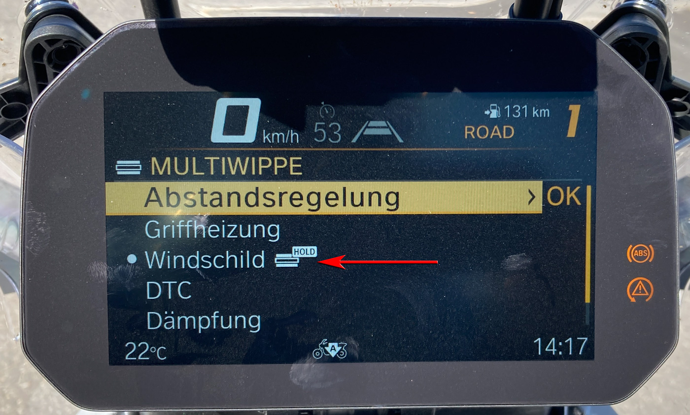 Das Windschild läßt sich elektrisch stufenlos einstellen. Zusammen mit den Winglets rechts und links funktioniert es einwandfrei und ich konnte mit offenem Visier fahren. Bei Abschalten der Zündung fährt es in die unterste Stellung zurück.