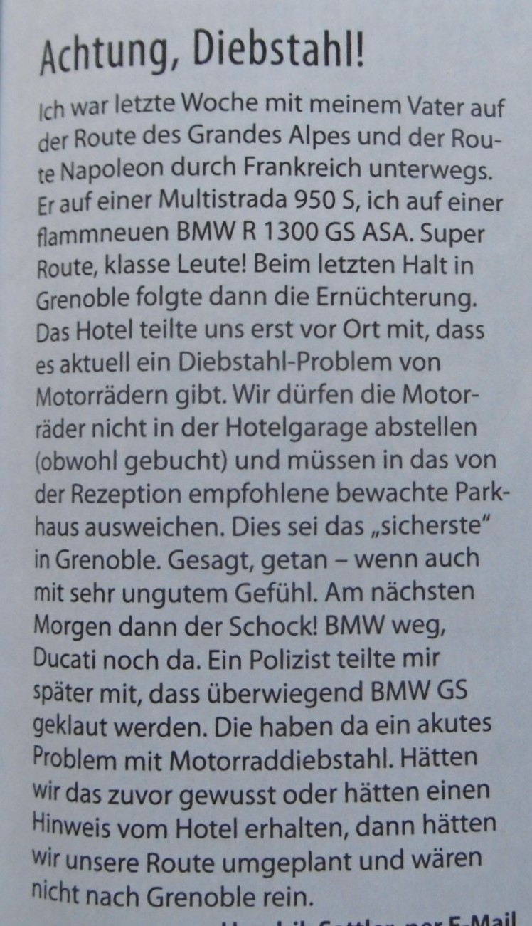 Der Polizei scheints egal, die machen halt ihren Papierkram. Der Versicherung verschafft es ĂŒber die Zeit höhere PrĂ€mien. Welche durch die Kunden bezahlt werden. Dem Hersteller zusĂ€tzliches Business, denn jede geklaute GS ist eine neu verkaufte GS.