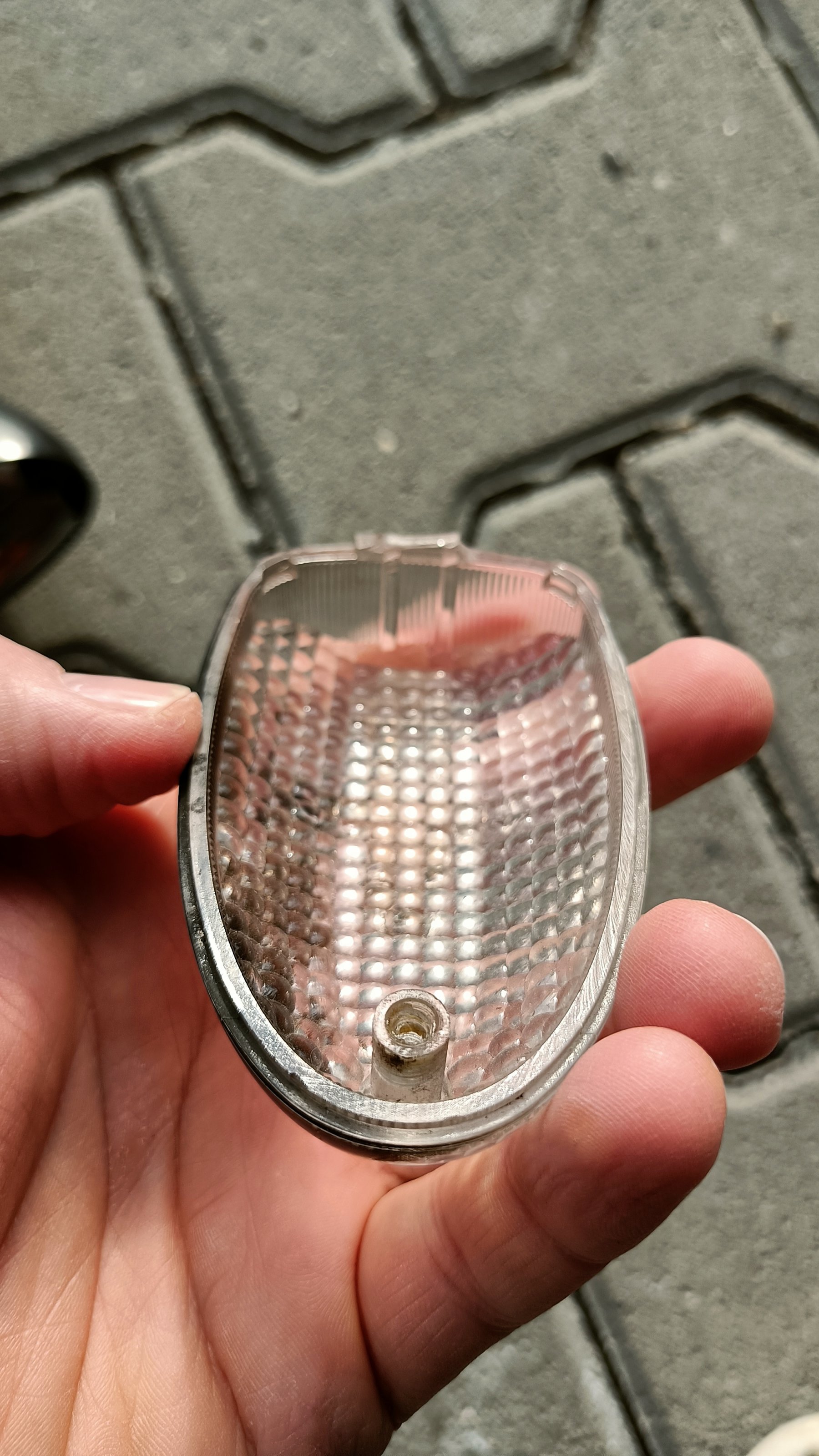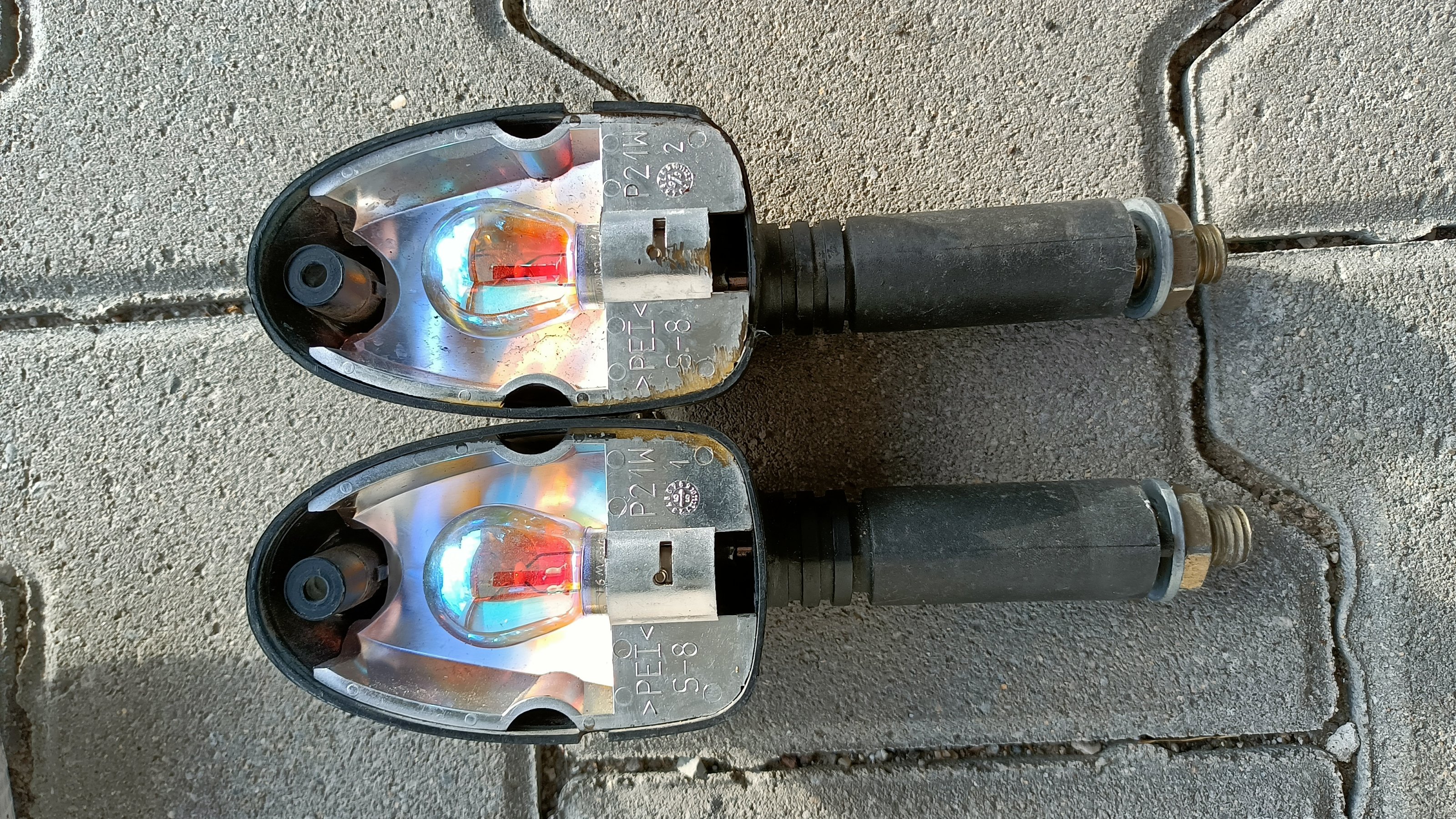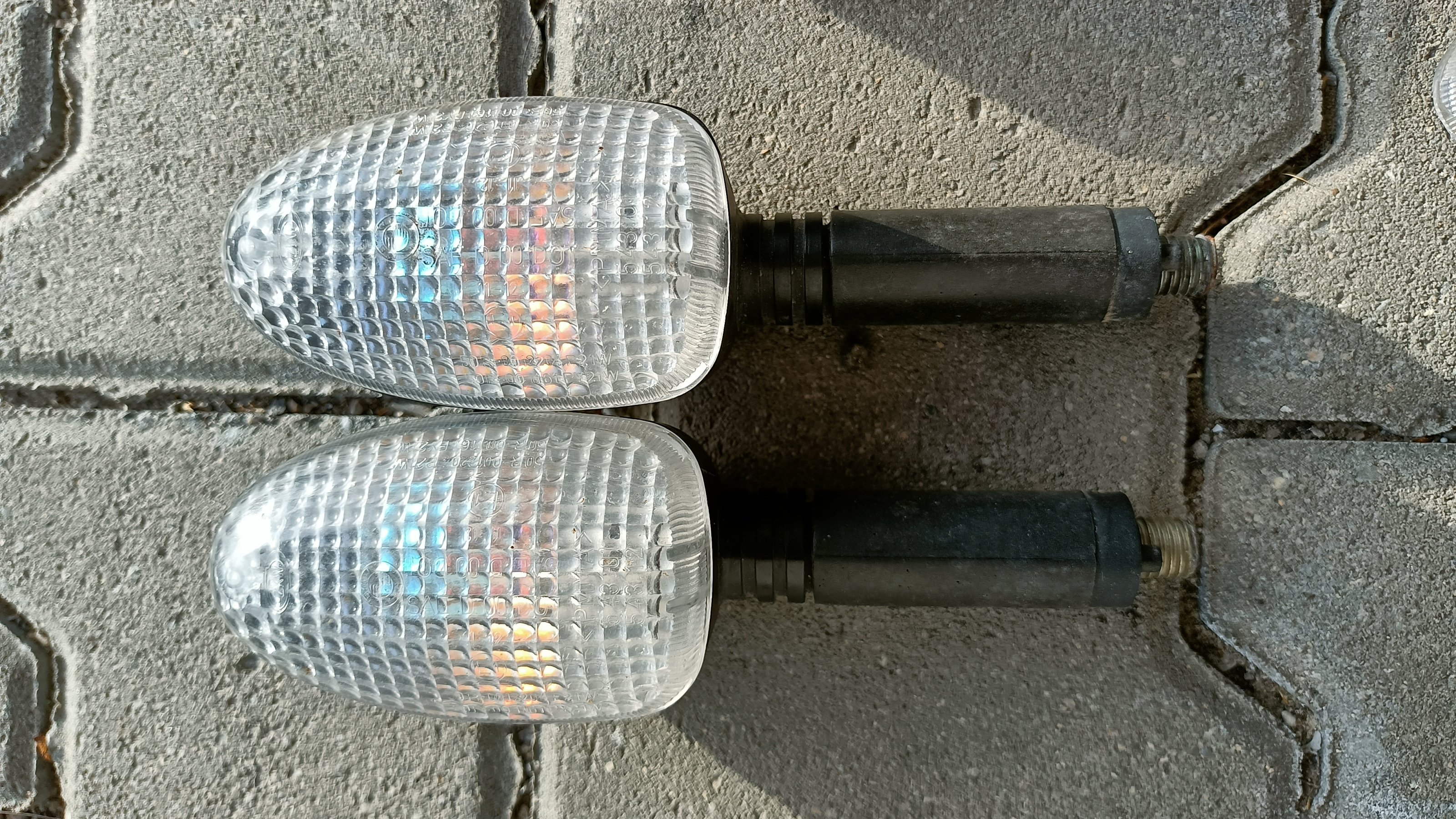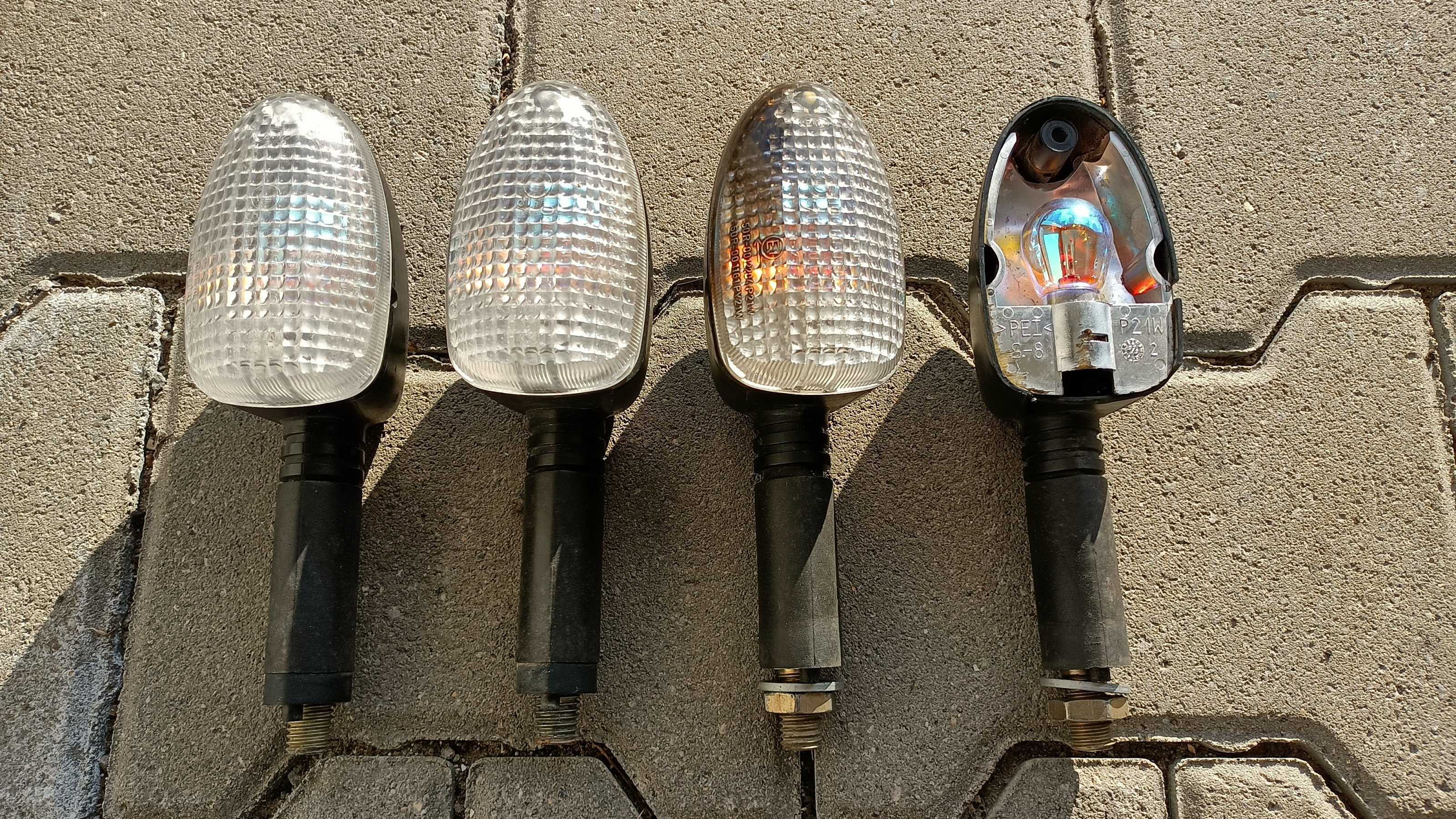 • Satz Blinker inkl. Leuchtmittel und weißen Gläsern. Achtung, von den Gläsern sind aber leider nur noch drei vorhanden! Ein Blinkergehäuse hat zudem Kampfspuren, hat aber jahrelang dennoch tadellos gehalten. Bei den Gläsern ist die Nase ab, was aber überhaupt nicht stört, hält mit der Schraube dennoch bombenfest. Das eine Glas ist etwas verrußt, sollte aber sauber zu bekommen sein. Preis für alle zusammen 20,- Euro