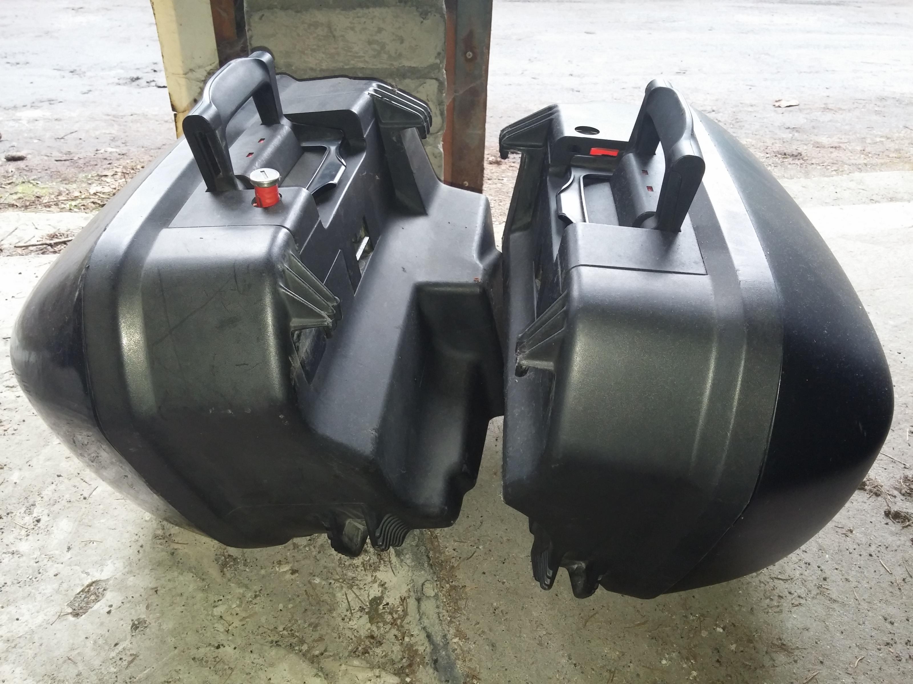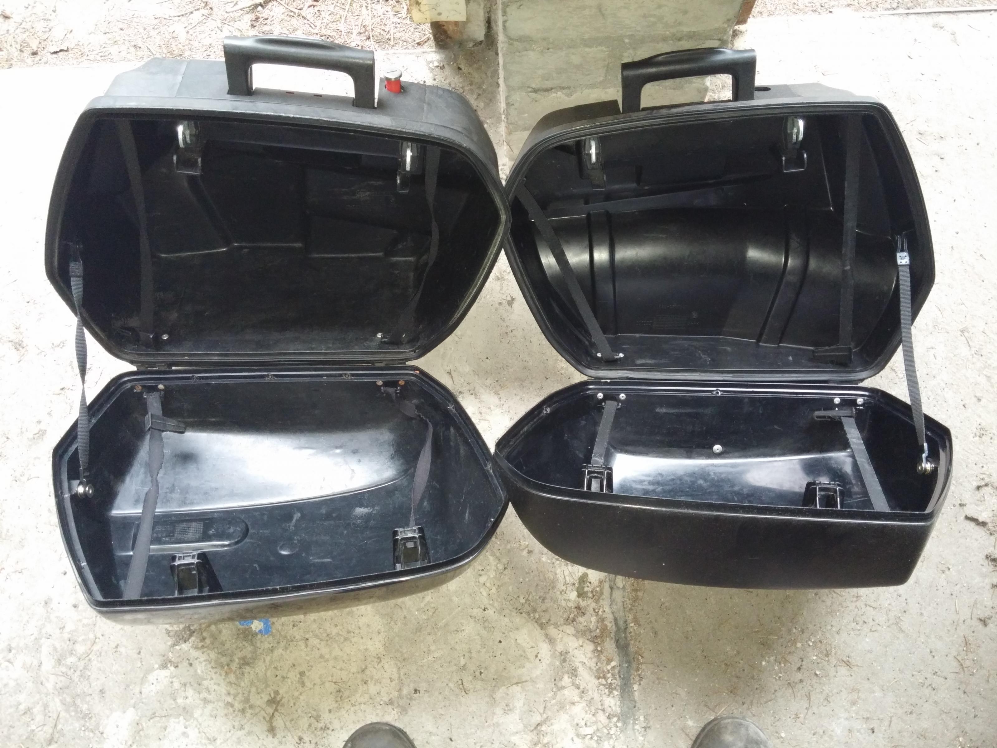 Ein paar BMW Touring Koffer mit Gebrauchsspuren. Ein Schloss ist vorhanden. Wenn noch eins beim Freundlichen besorgt wird, kann man die Schlösser da auch gleich auf Gleichschließung zum Moped "umbauen" lassen