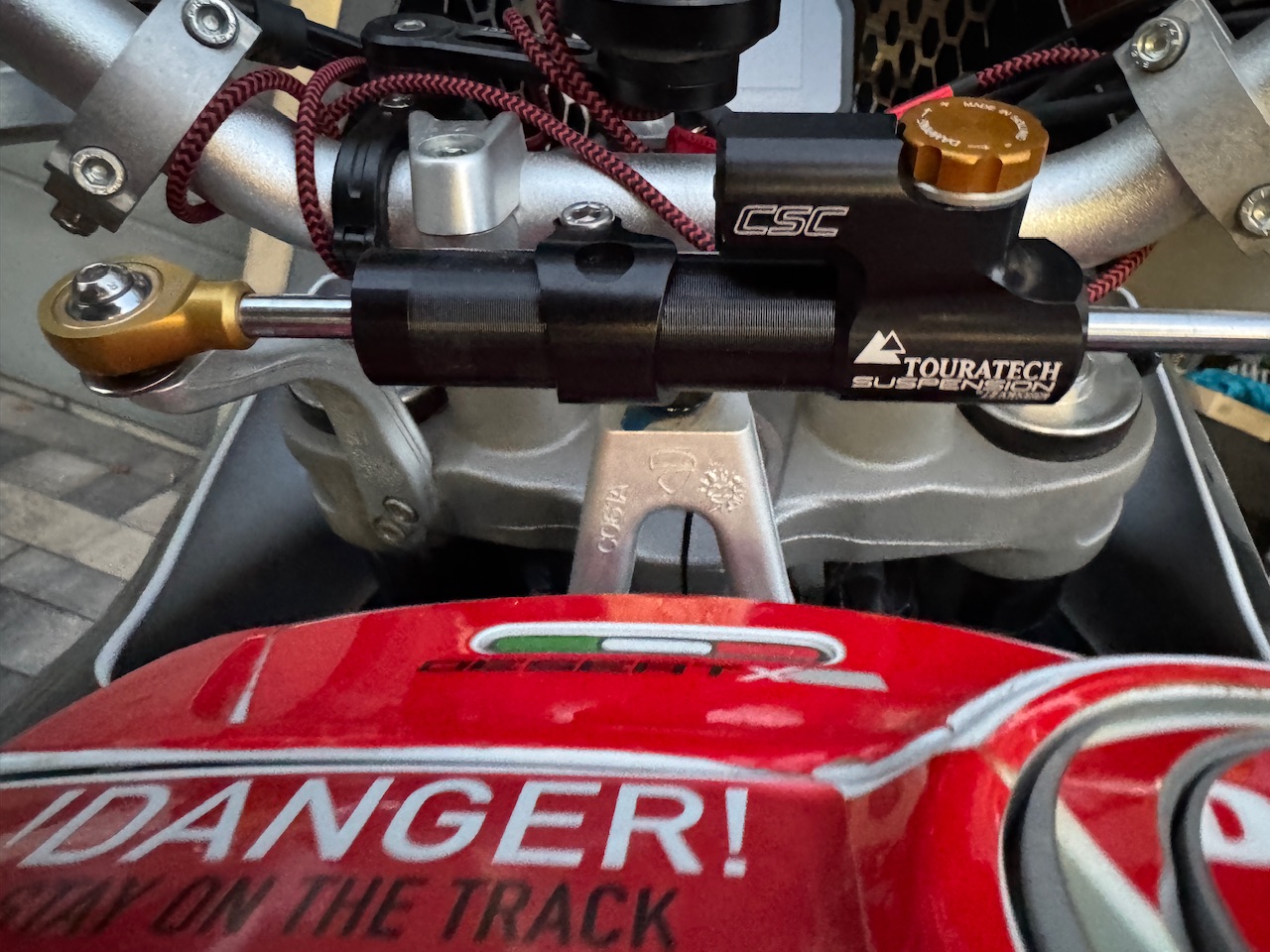 Und ein weiteres Update soeben verbaut: den nichtsnutzigen Lenkungsdämpfer gegen einen verstellbaren von Touratech getauscht. Hoffe auf ein verbessertes Handling bei den nächsten Ralleys.