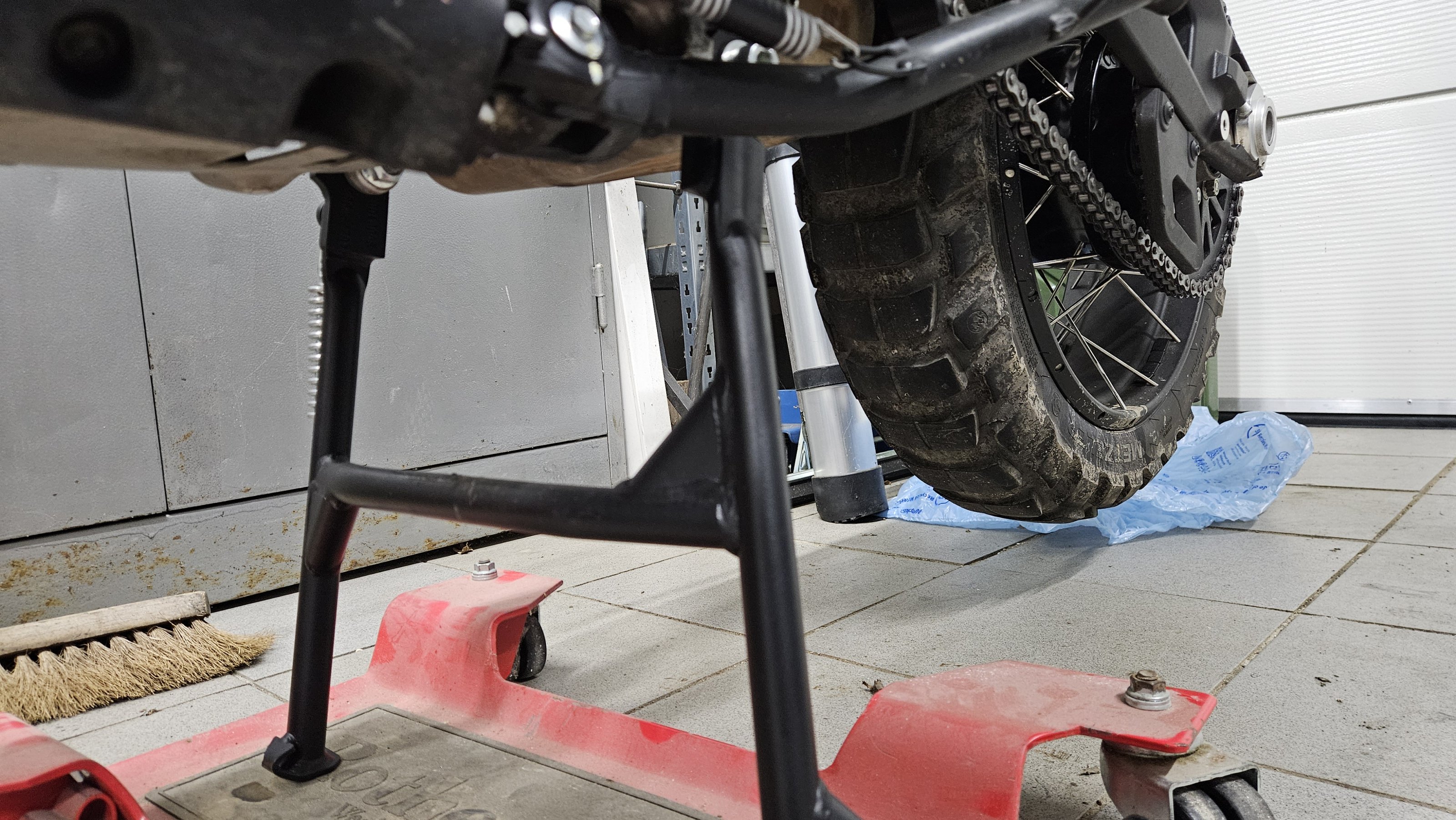 MeinSeitenstäder Plate ist kontraproduktiv, weil ich die Rally DX ,noch mehr seitlich nach rechtsneigen muss ,um den Seitenständerkorrekt nach vorne auszufahren . Der Bleibt auf halben Weg schon hängen ,was ein Nachteil der langen Federwege ist .