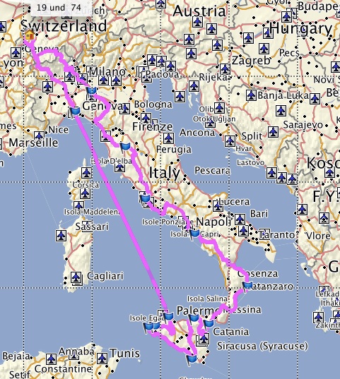 Dieses Jahr geht es mit dem Autoreisezug nach Livorno, per Achse nach Neapel, dann Fähre nach Palermo, Fähre nach Villa San Giovanni, per Achse nach Bari, Fähre Dubrovnik und per Achse nach Hause.