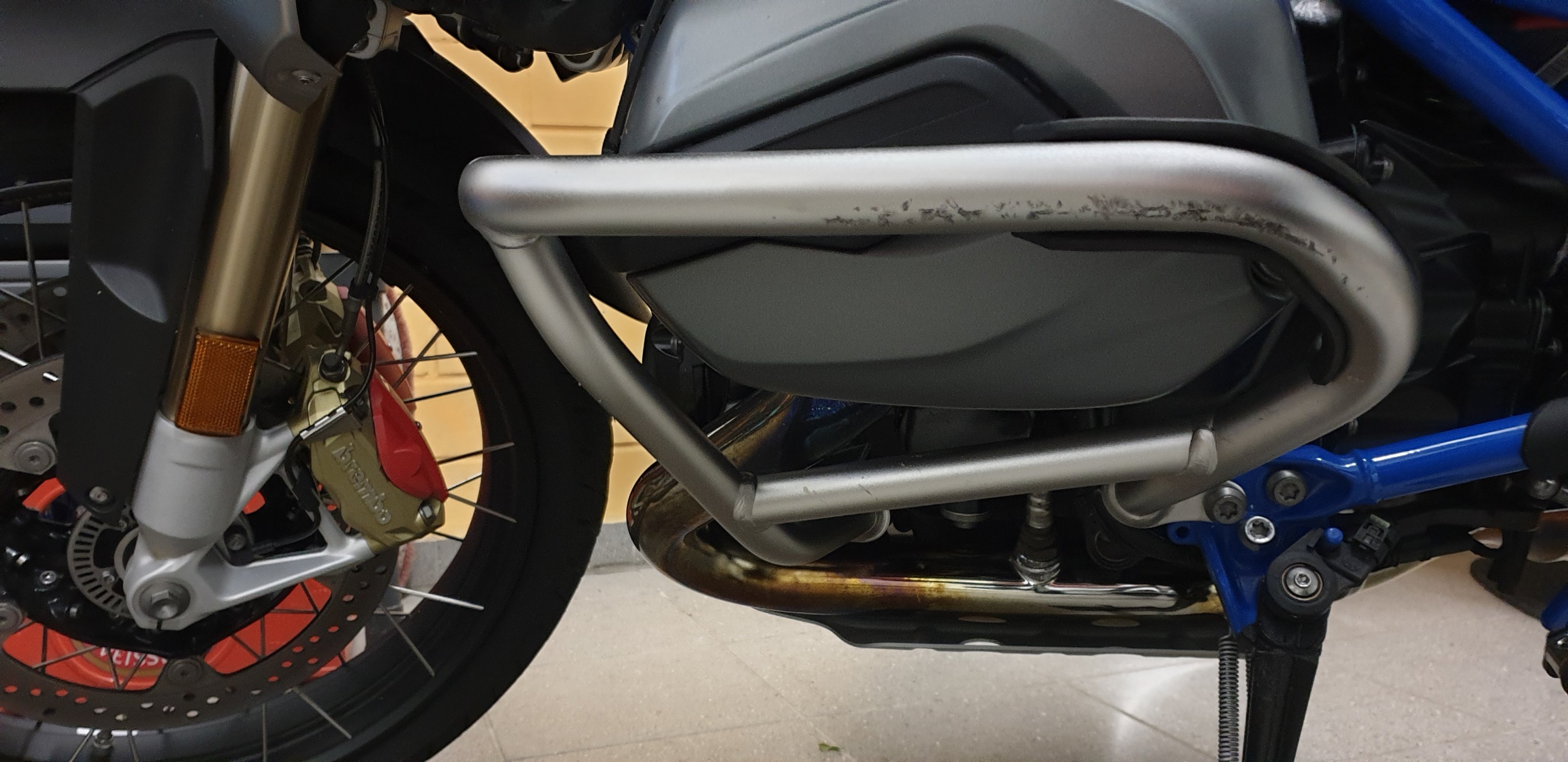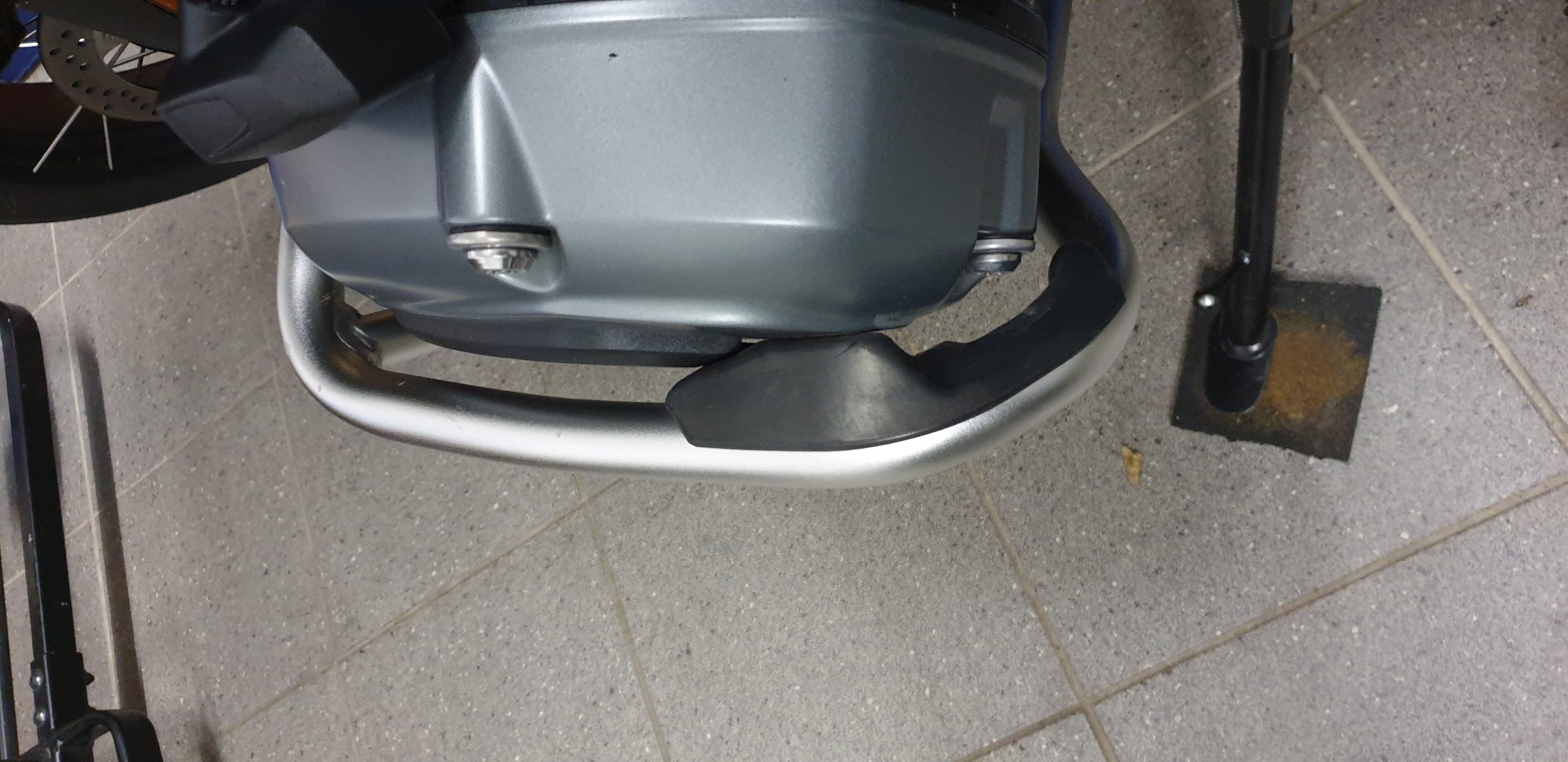 Die BMW Endurofußrasten sowie der linke Sturzbügel. Die Bilder zeigen die Beschädigung.