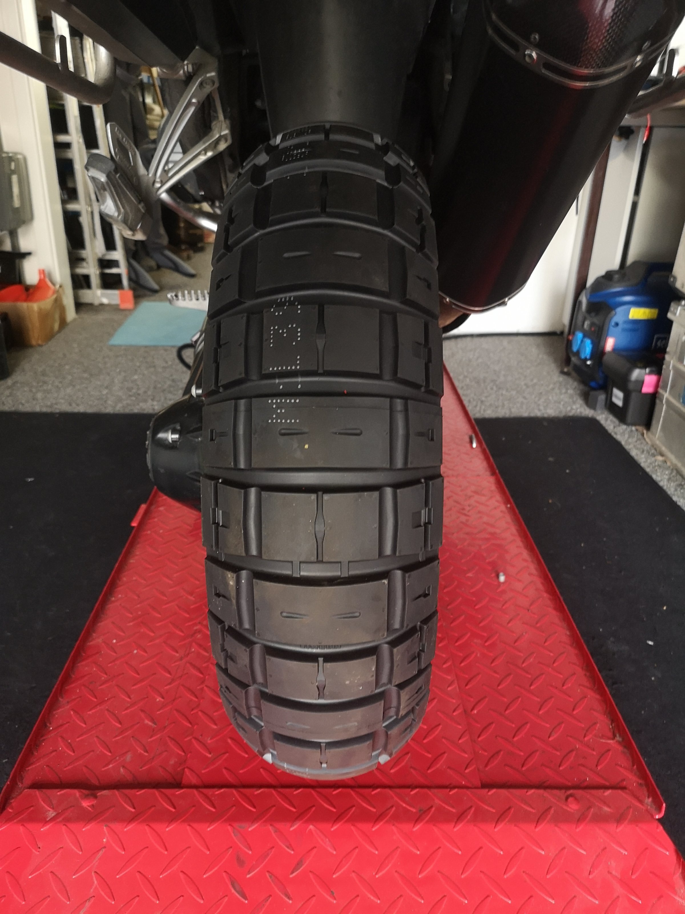 Danach konnte ich meine Karre ohne Ständer abstellen, so eckig war der Reifen abgefahren 😬