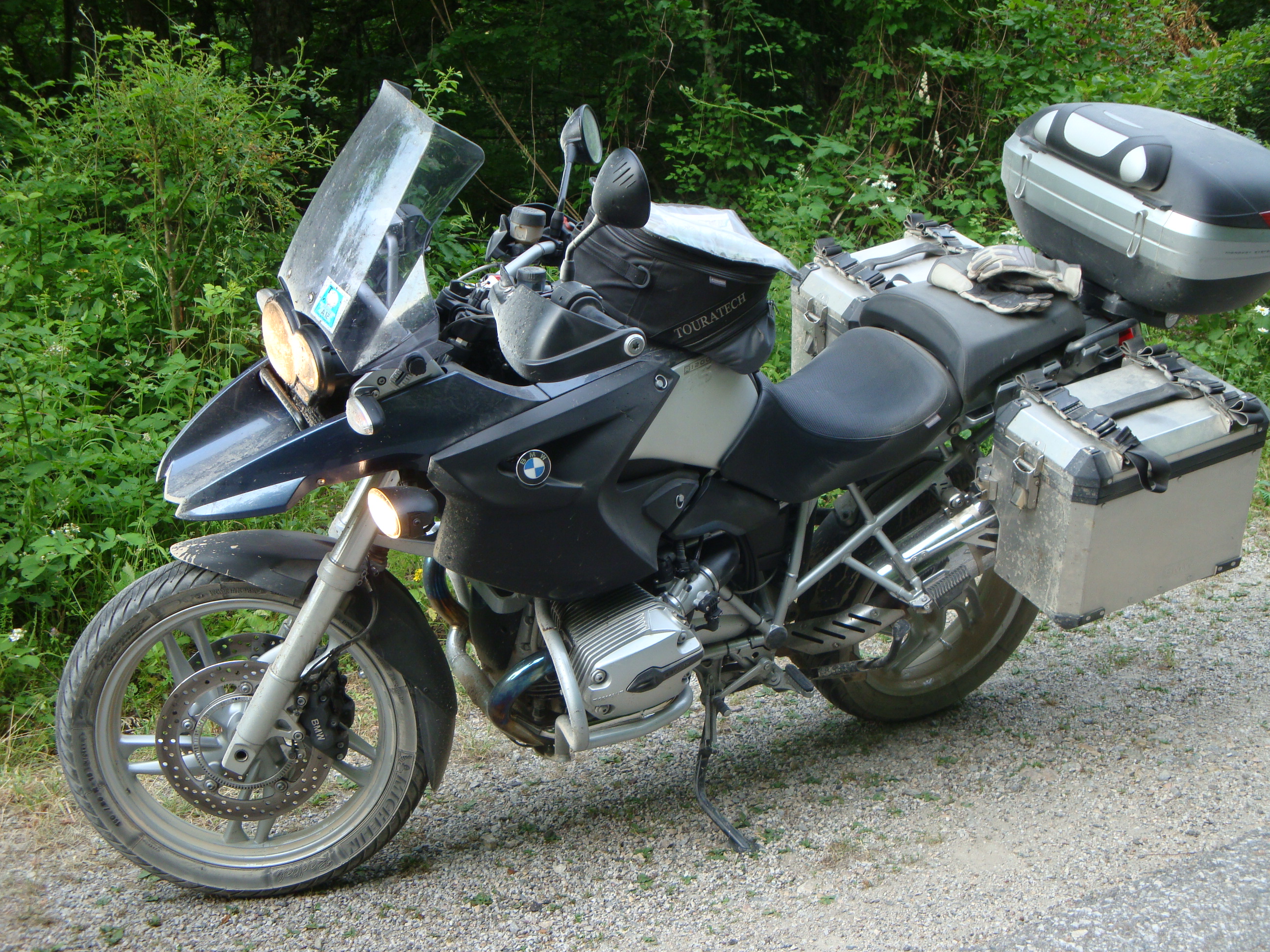 Zum Fahrer hin haben ein paar Stückerl massives Alublech (5 mm) mit 6er Bohrungen den Givi nach unten am ADV-Träger fixiert.