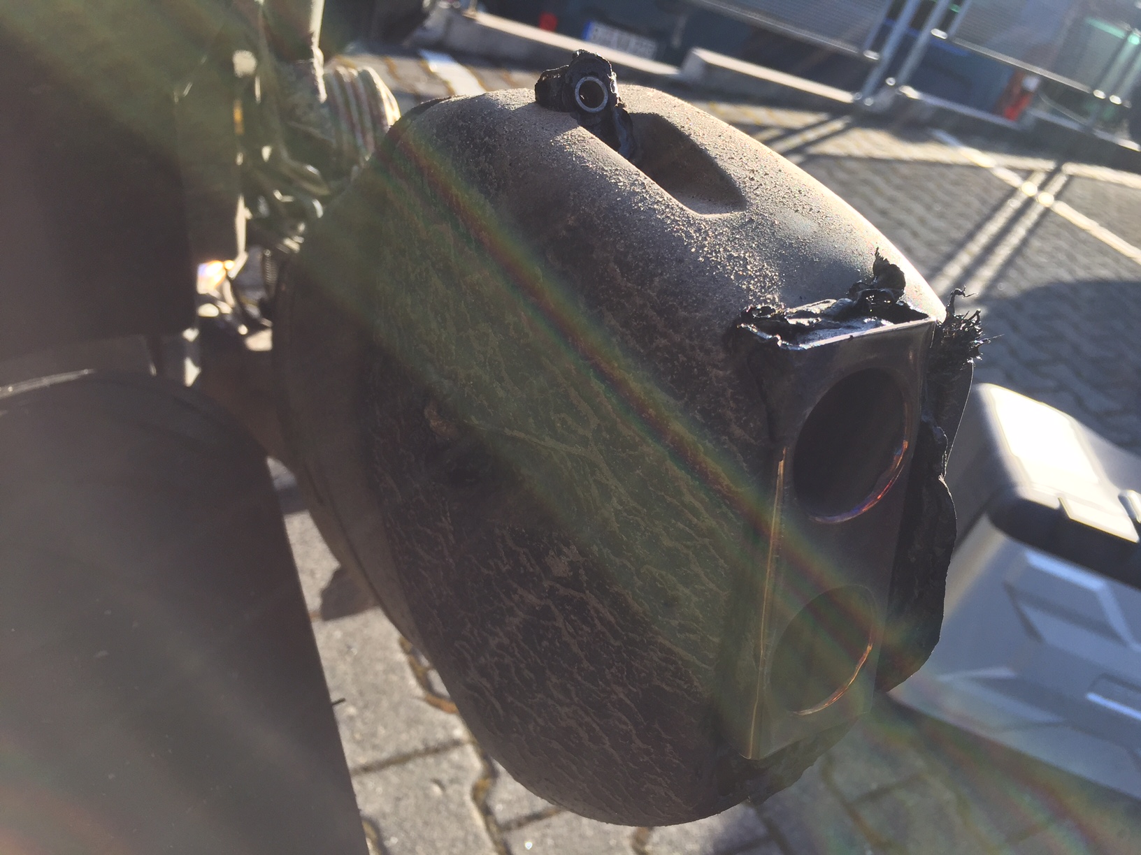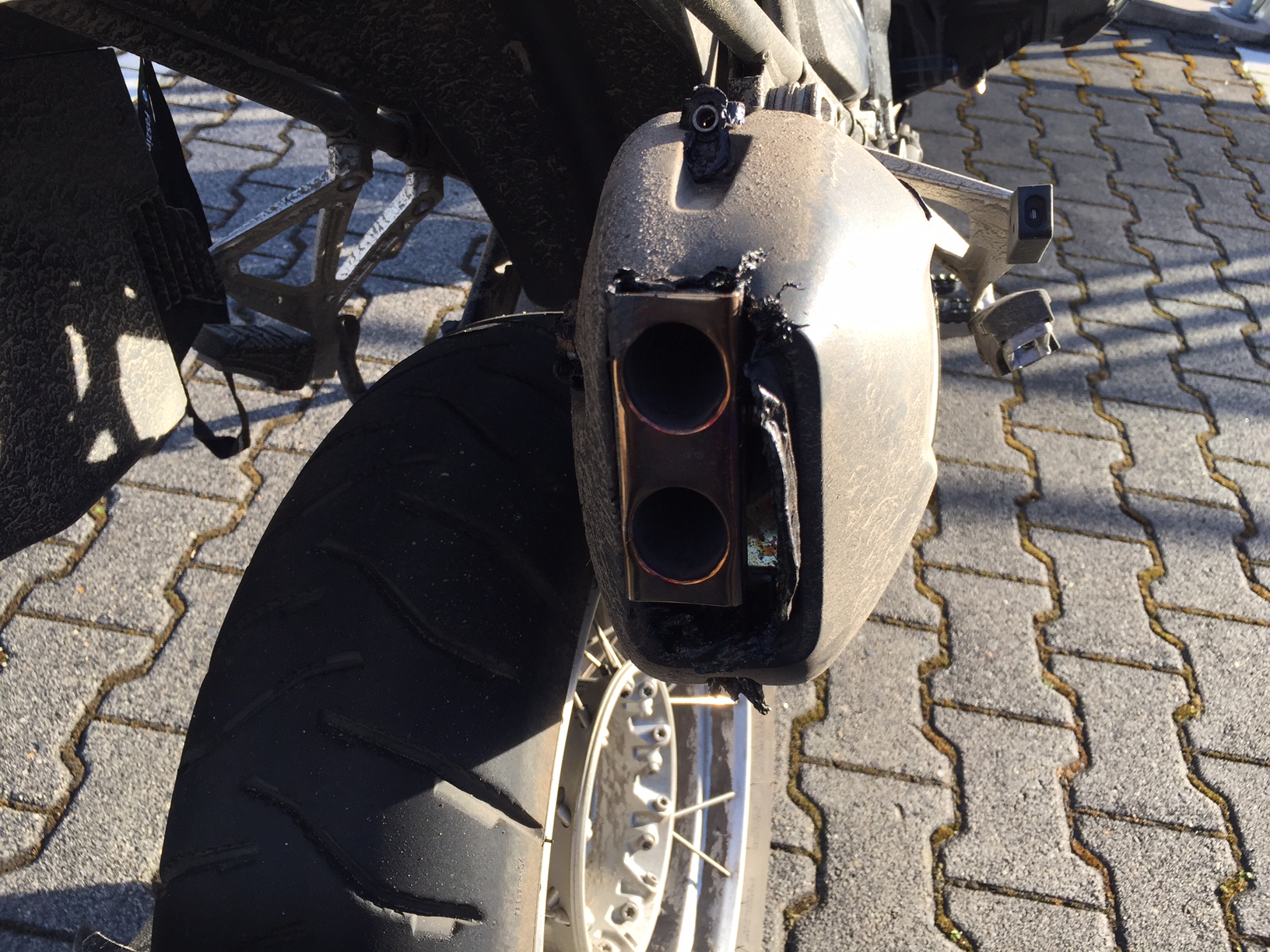 Anbei noch ein Foto von hinten auf den Endtopf. Verschöndert den Auspuff nicht unbedingt, fällt aber unter den Koffern (die ich immer dran habe) auch kaum auf.