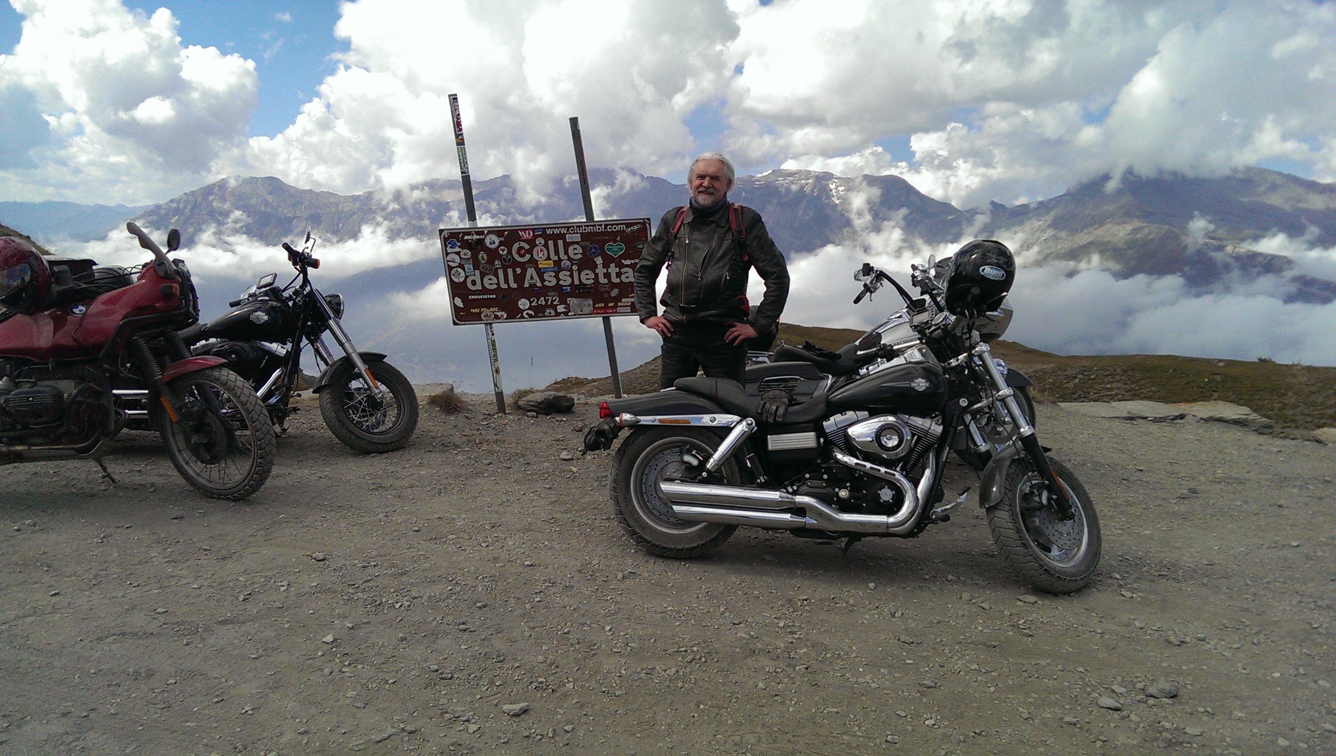 Gestern, nach Besichtigung der Kathedrale in Susa, sind wir zum Colle delle Finestre hochgefahren, von da aus weiter zum Colle dell'Assietta und dann weiter nach Sestriere. Die Strecke an sich durchaus auch allein zu bewältigen, bloß die drei tiefen Schlammlöcher Richtung Sestriere wären allein ein unüberwindliches Hindernis gewesen. Kurze Begehung, dann haben wir alle vier Maschinen jeweils zu dritt (Fahrer drauf, einer rechts u. links zum stabilisieren) durchgeschleust. Von zwei Östereichern, die auf Enduros entgegenkamen, gab der zweite vor dem letzten, schlimmsten Wasserloch auf, dem haben wir dann auch noch durchgeholfen