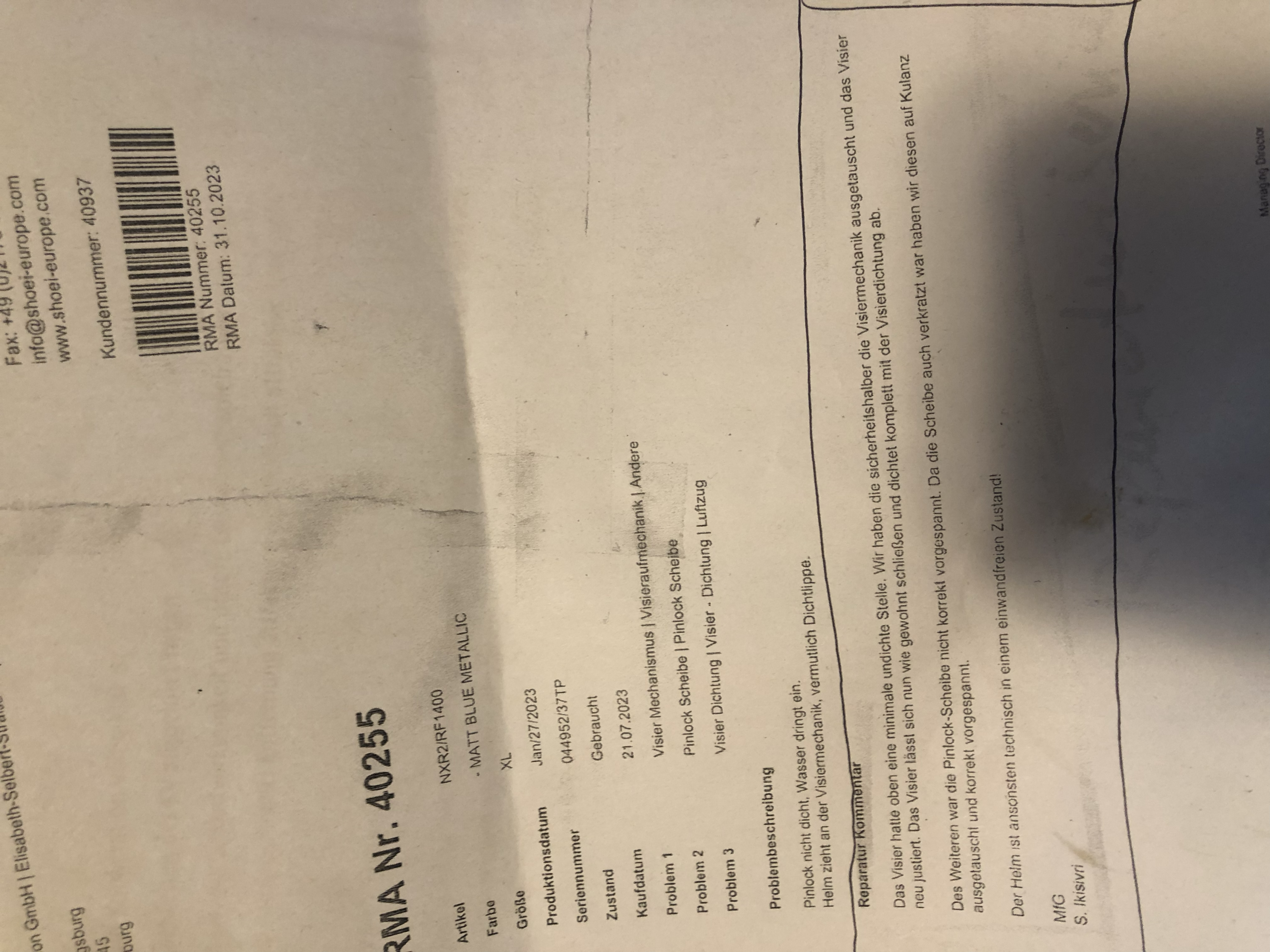 der Helm war auch schon bei Shoei zum Check, siehe Foto.
