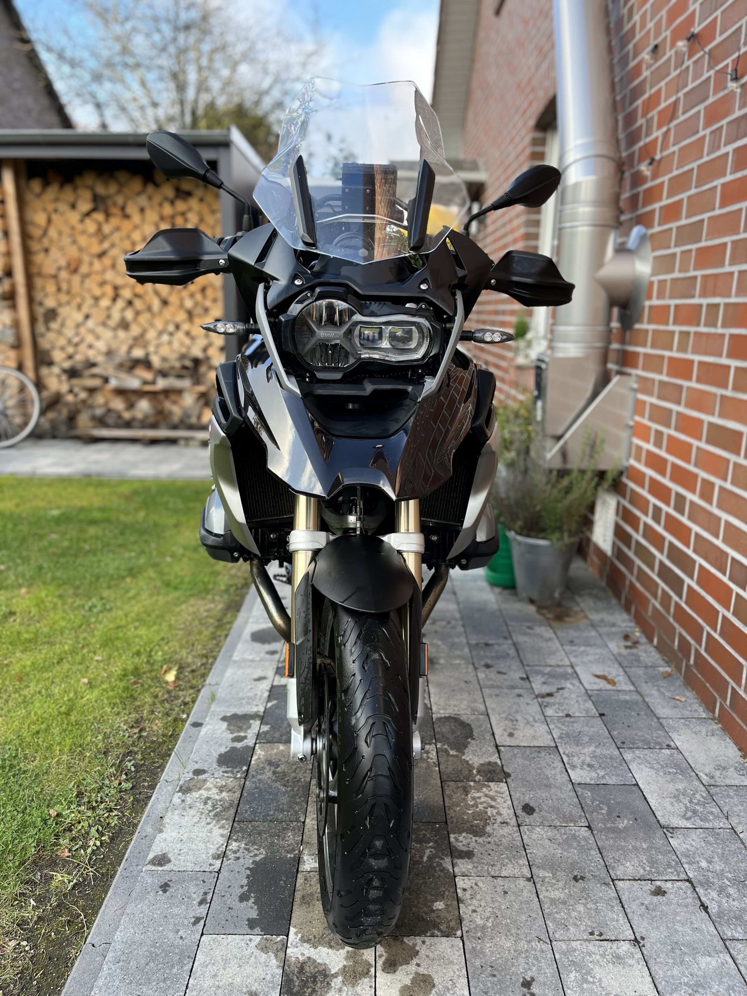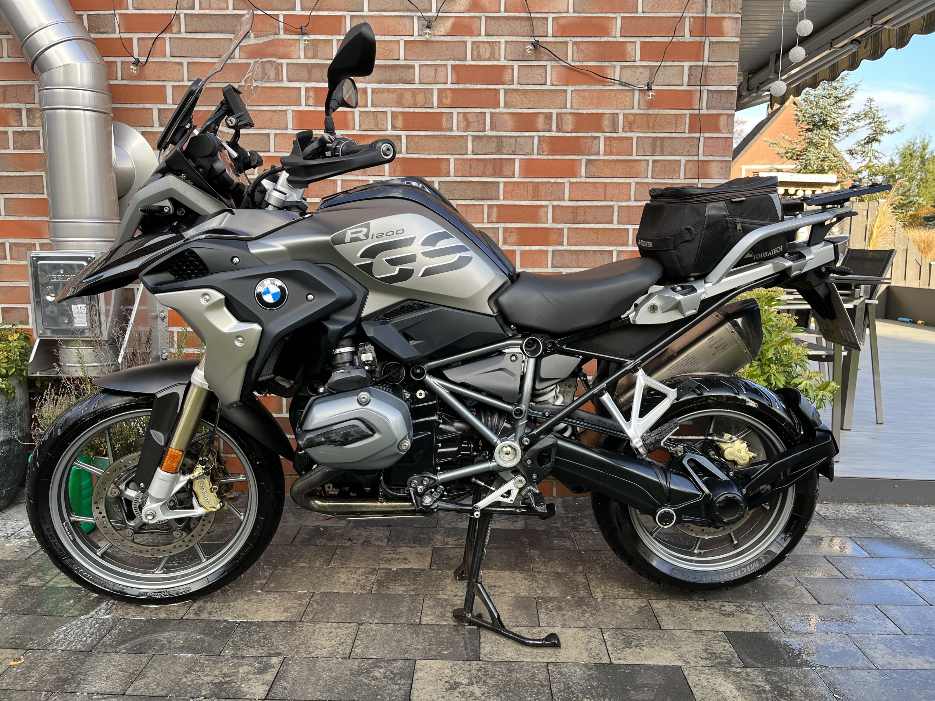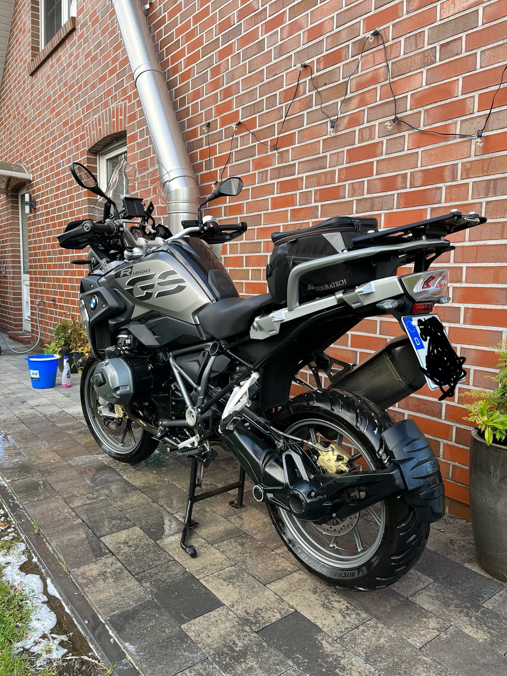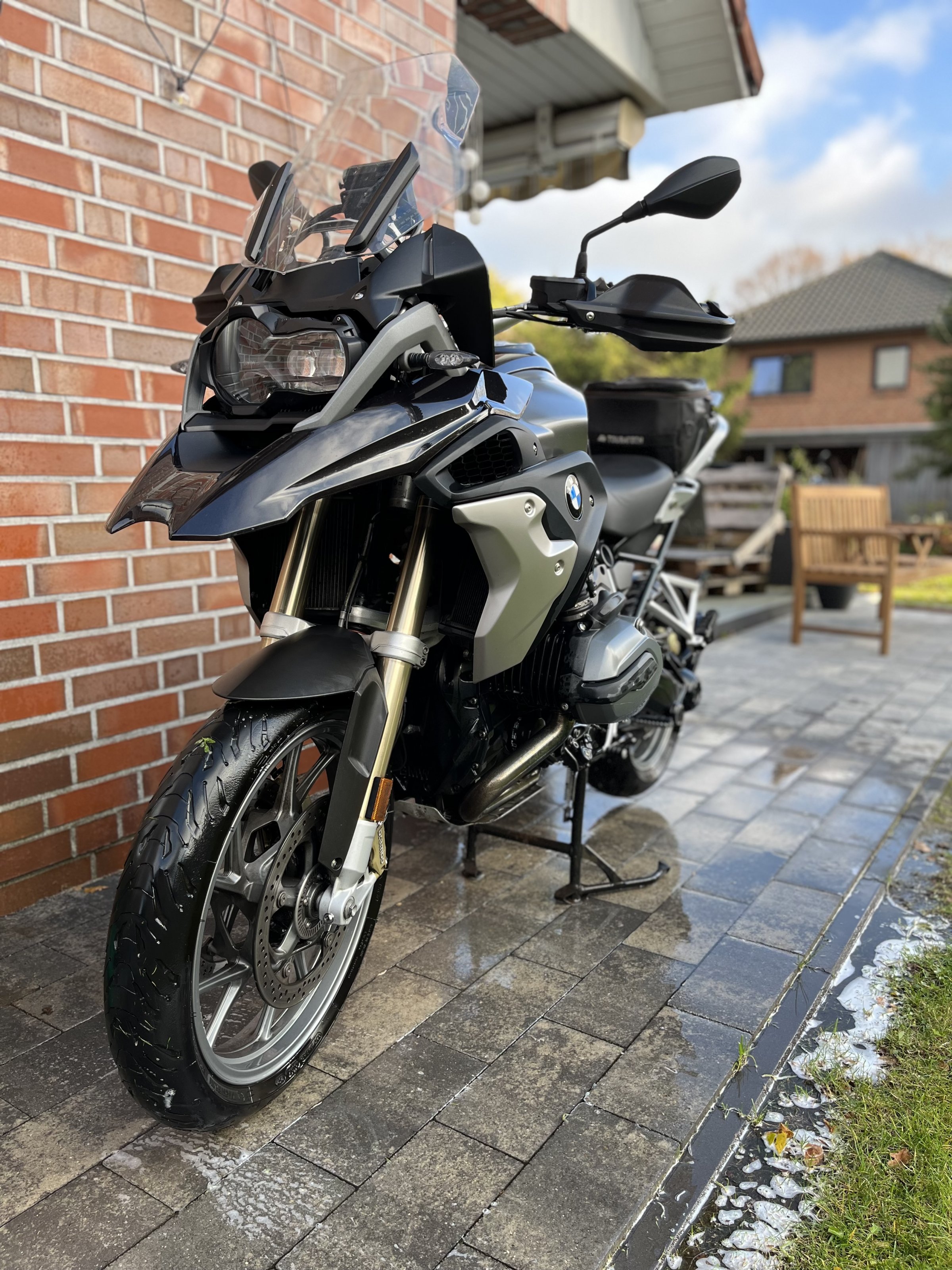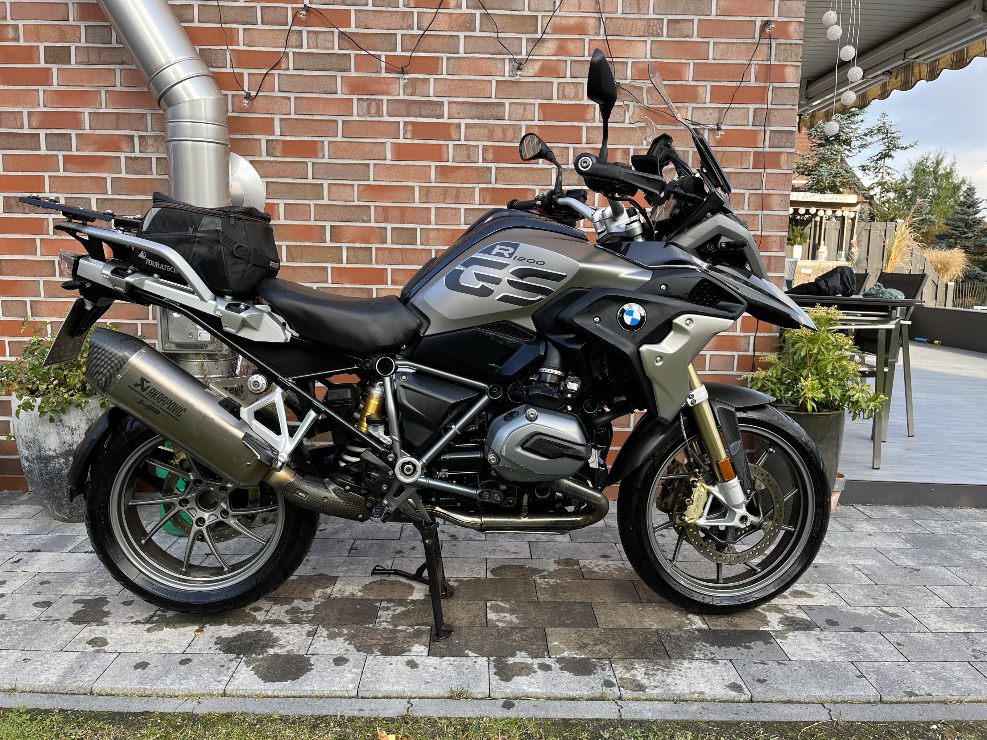 Gelände hat sie nie gesehen, darum habe ich die Alufelgen geordert. Ist auch pflegeleichter :-). Das Topcase und die Hecktasche von Touratech sind dabei, für den bereits montierten Akra hätte ich gerne 350,-€.
