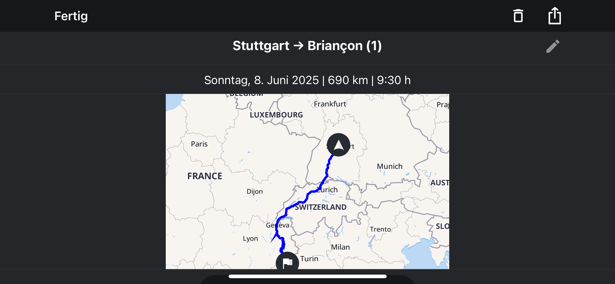 Ich sitze eben in Briancon, heute morgen bin ich wegen des Regens um 7 Uhr losgefahren und nach 9,5 Stunden Netto-Fahrzeit plus in Summe 1,5 Stunden Pause/Tanken bin ich immernoch fit. COL de Madelaine, Telegraph und Galibier sehr flott gefahren. Auf Karoo4.