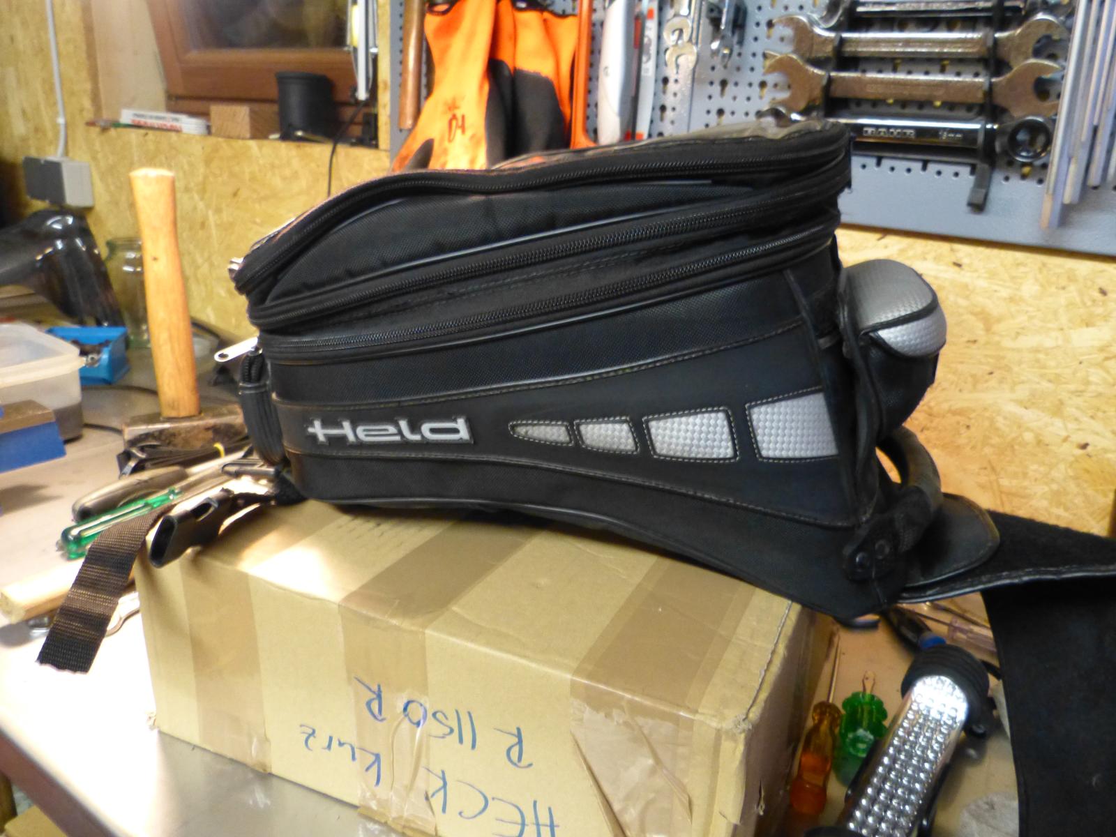 und Held-Tankrucksack, gebraucht aber nix kaputt, mit Riemenbefestigung wie abgebildet