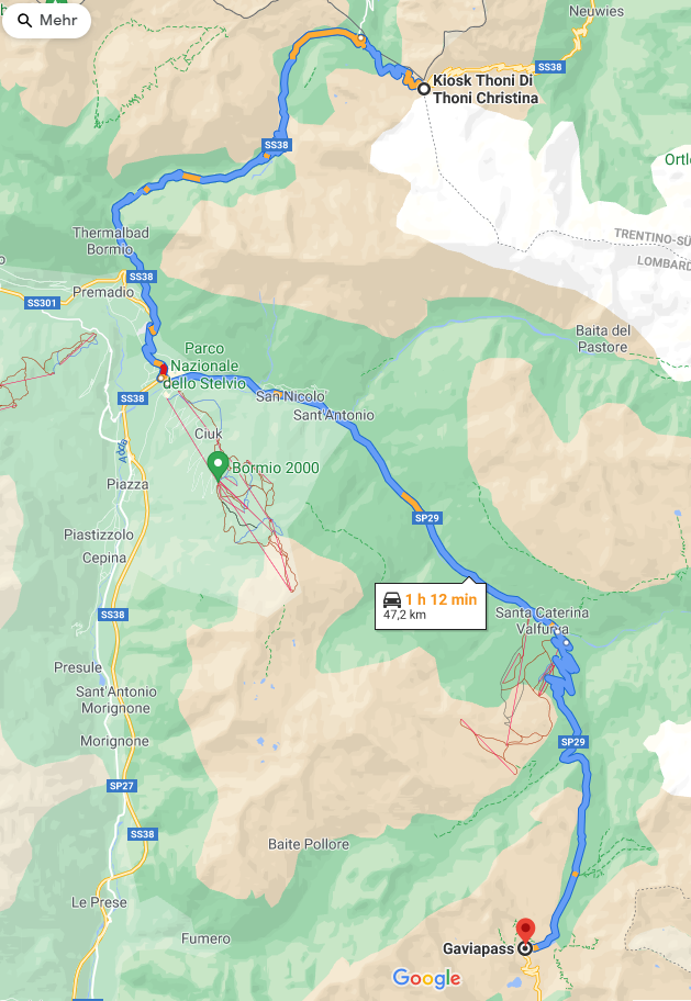 Habs noch mal schnell eingegeben. Tibethütte bis zum Hotel Giner nach Mezzana. Führt mich nun brav über den Gavia.