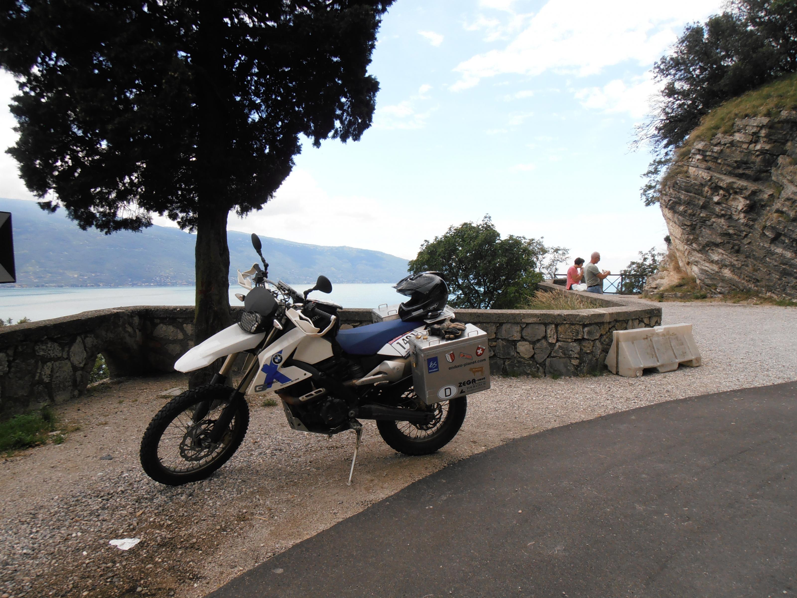 Nun saß ich auf der Mauer hinter mir eine grandiose Aussicht auf den Gardasee und vor mir meine zuverlässige G650X Ch.