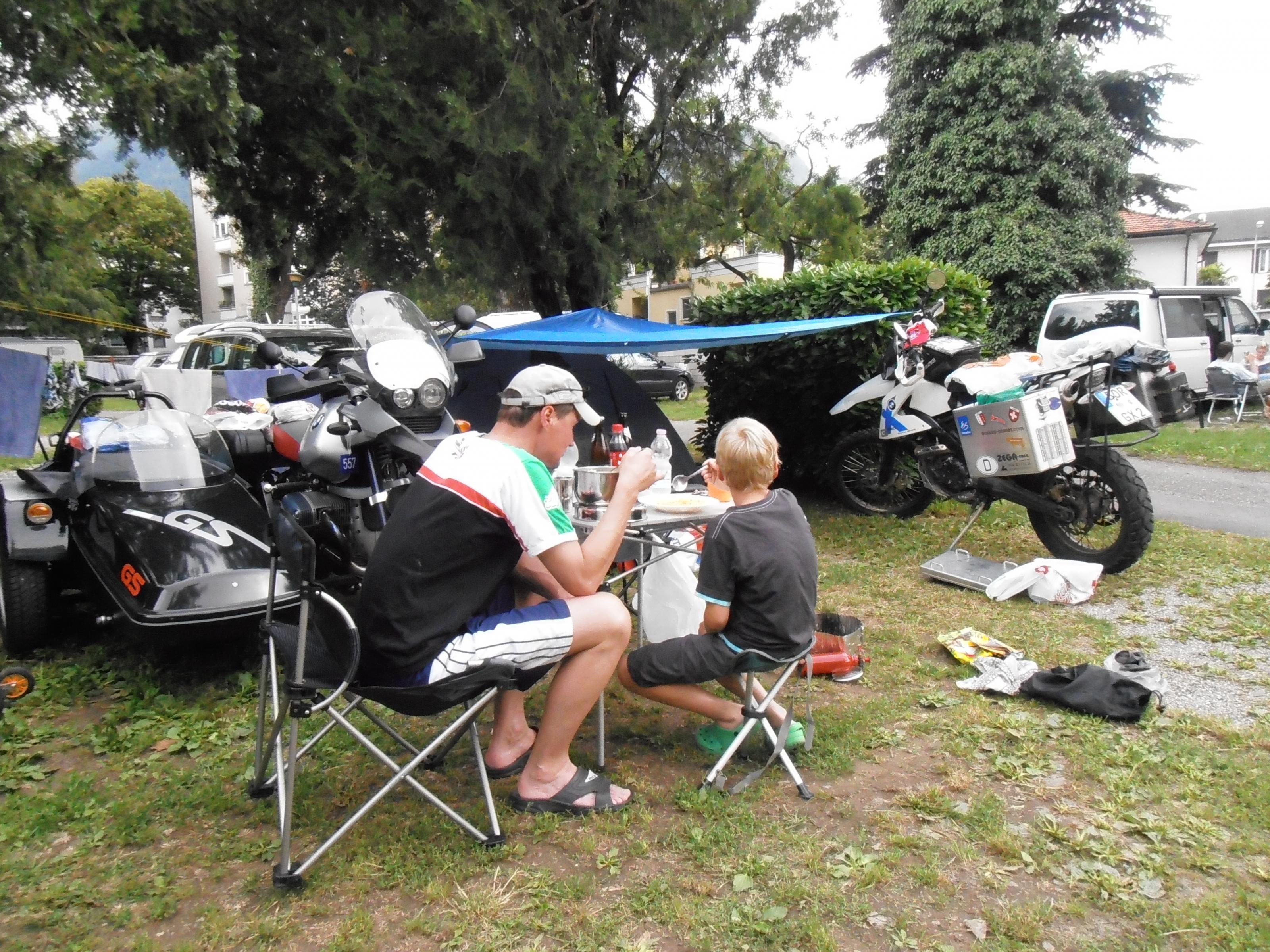 Und nun saßen wir drei da, Noah hatte sein Trikot an, ich saß noch in Motorradklamotten da, da ich noch die Motorräder getankt hatte, damit wir morgen früh so los fahren konnten.