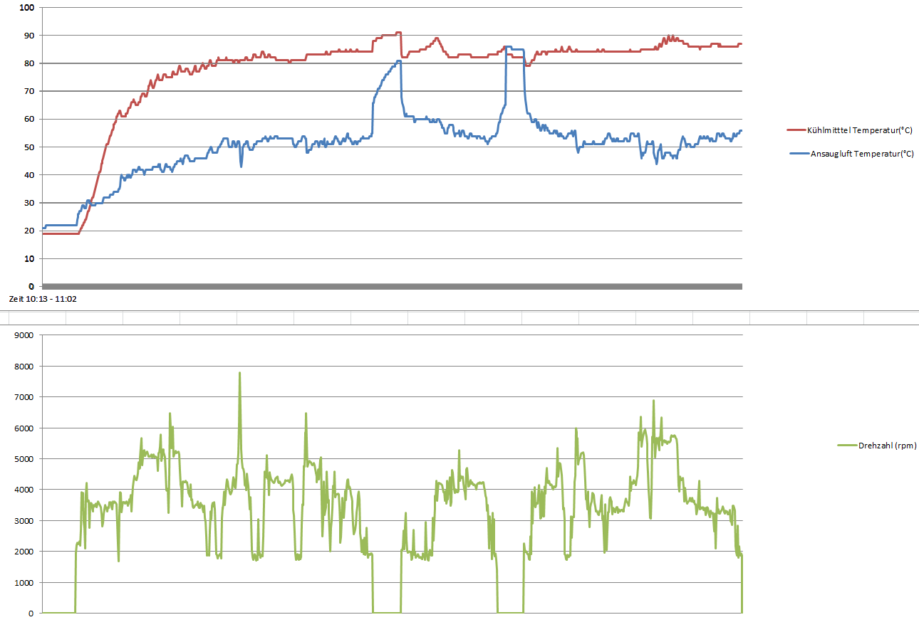 Der Originalsensor für die Temperatur der Ansaugluft scheint sich durch die Motorwärme viel stärker aufzuheizen als gedacht. Die vorbei rasende Ansaugluft kühlt ihn zwar immer wieder etwas herunter aber lange nicht genug. Der Sensor meldet ständig Werte zwischen 45° und 55° an die Motorsteuerung. Wenn die Kiste mal kurz steht, geht es hoch bis 90° (siehe angehängte Diagramme). In meinen Augen ein echter Konstruktionsfehler!