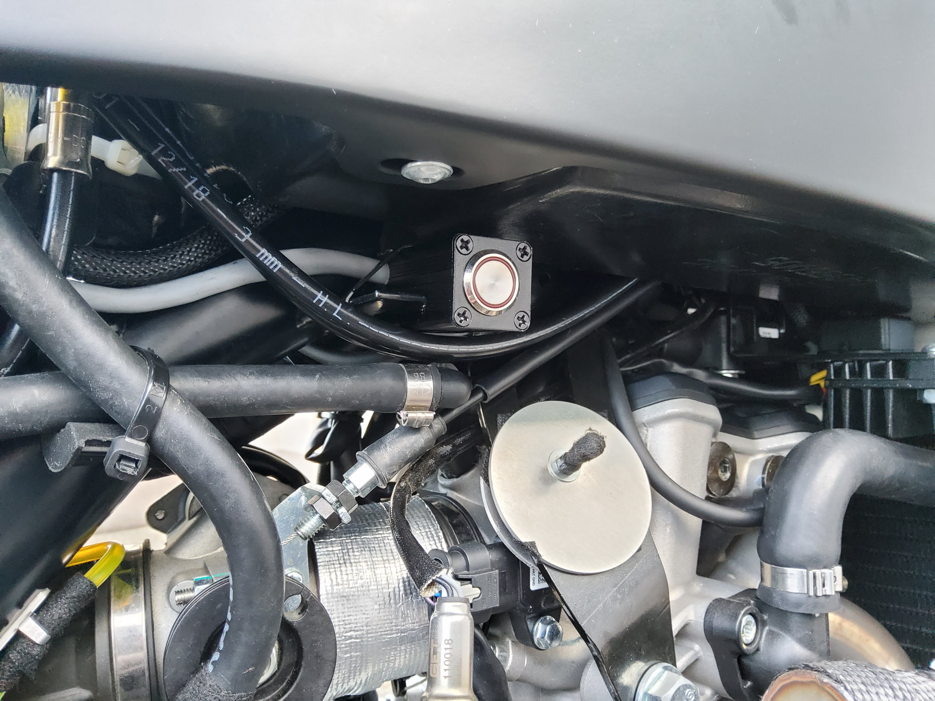 Zur Anzeige und Aktivierung Crossmode (häufigere Ölung) wurde ein Drucktaster mit integrierter LED in Metallgehäuse unter Tank verbaut.
