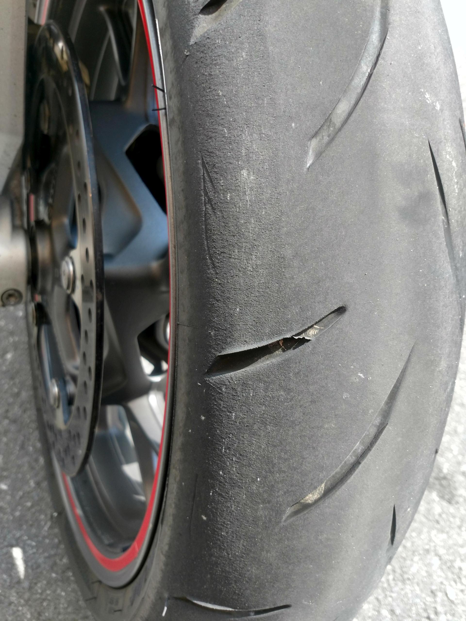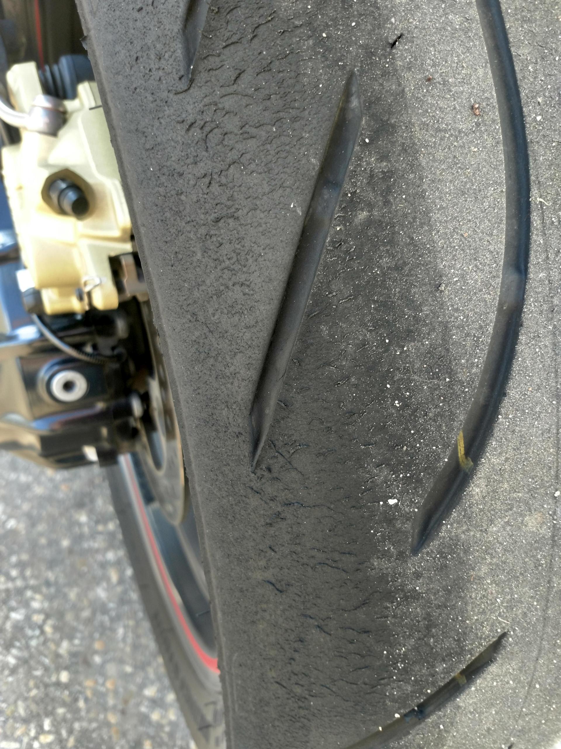 Nein, ist laut Hersteller ein Materialfehler, dort verschmilzen sich bei entsprechender Gangart Gummimischungen, die angeblich keine Auswirkung auf das Fahrverhalten haben sollen. Für diese erwähnte Gangart sollte der Reifen aber ausgelegt sein, wie man sieht hat der sonst nix.