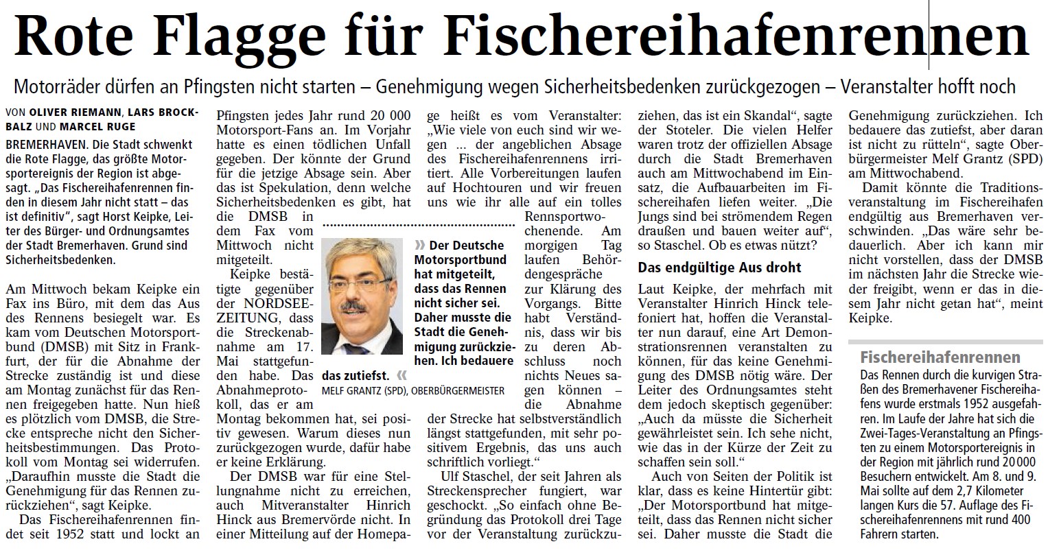 Diskutiere Fischereihafenrennen Bremerhaven abgesagt ? im Motorrad allgemein Forum im Bereich Community; Moin, gerade wurde in der Regionalsendung durchgegeben, das Fischereihafenrennen ist abgesagt worden, weil der Motorsportbund die Rennstrecke...