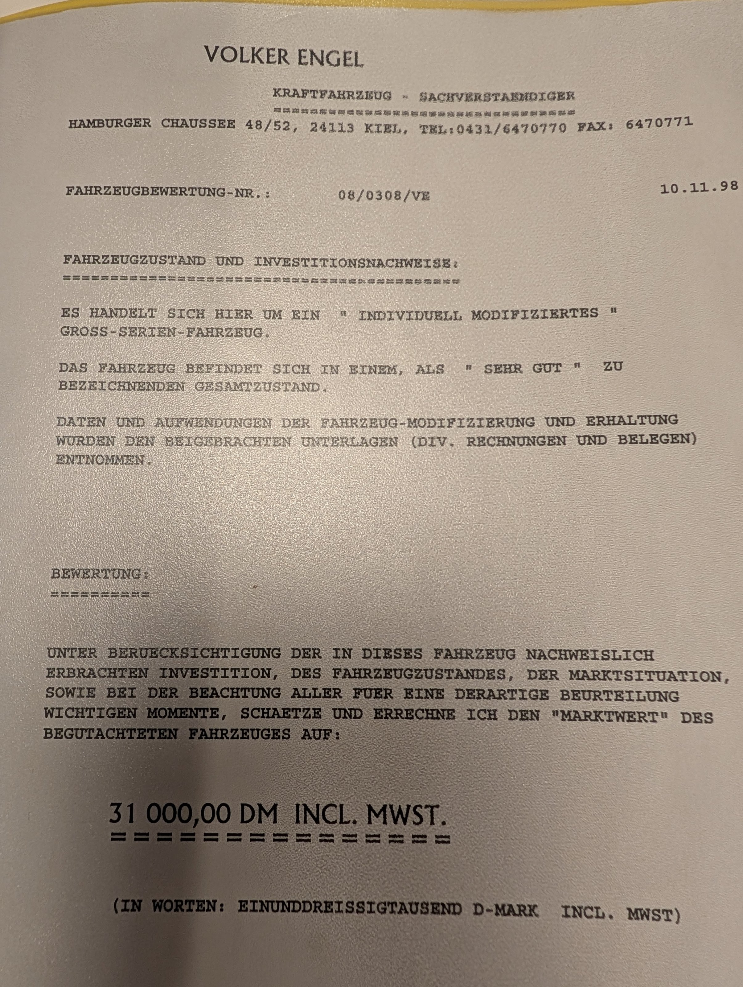EZ ist 1996, der Umbau hat 1998 in einer Fachwerkstatt in Kiel stattgefunden und wurde mit einem Gutachten dokumentiert.
