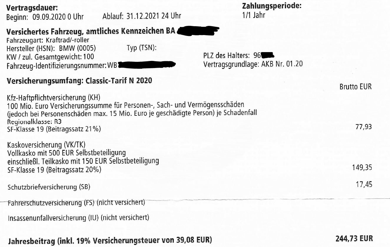 Und bei den 240 ist sogar noch ein Schutzbrief für 18 Euro inklusive. Sonst wären es nur 222 Euro Vollkasko.