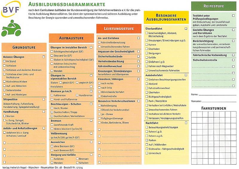 Nach Vorgabe der FahrschAusbO (§5 Abs.1 Satz 6) ist die Stand der Ausbildung schriftlich zu dokumentieren, wobei dies auch in anderer, schriftlicher Form als dieser Diagrammkarte erfolgen kann. Wie bitte schön, soll denn der orangefarbene Teil regulär gemacht werden, wenn gesetzlich die anderen 12 Stunden (gelb) im Umfang und Inhaltlich vorgeschrieben sind.