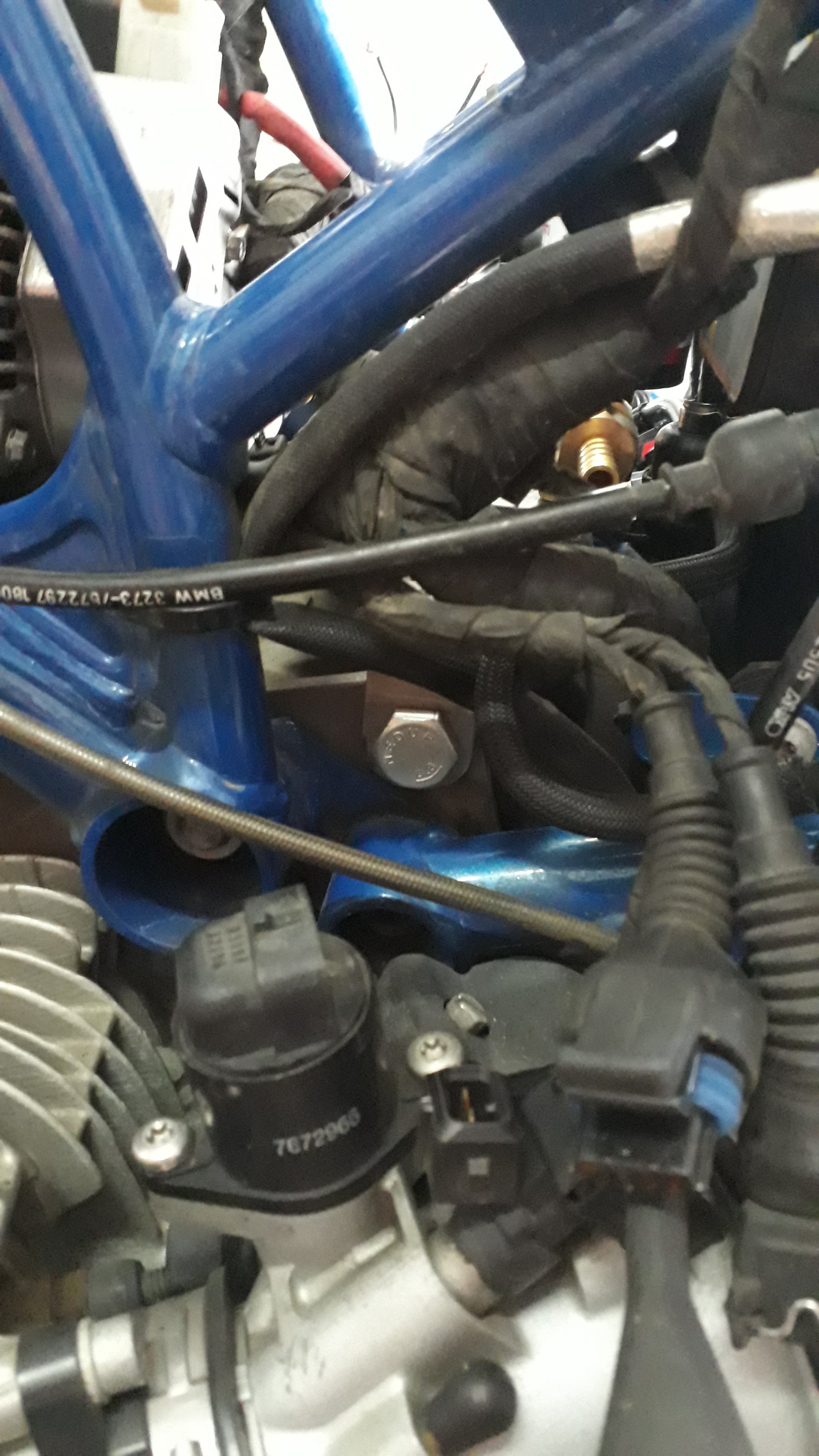 Beim Tanken pumpen die beiden Benzinpumpen den Sprit in den GAP-Tank, während die Entlüftung über den gleichzeitig geöffneten Benzinhahn über die Rücklaufleitung der BMW-Pumpeneinheit in den Haupttank. Beim Fahren wird der Sprit zurück in den Haupttank gesaugt. Da die beiden neuen Bezinpumpen ein integreirtes Rückschlagventil haben, habe ich einen Bypass an einer Pumpe mit einem Querschnitt von 2,5mm gebaut. Über diesen wird während der Fahrt ausreichend Sprit zurückgesaugt bis der Zusatztank leer ist. Die Restlaufanzeige funktioniert genauso wie vorher.
