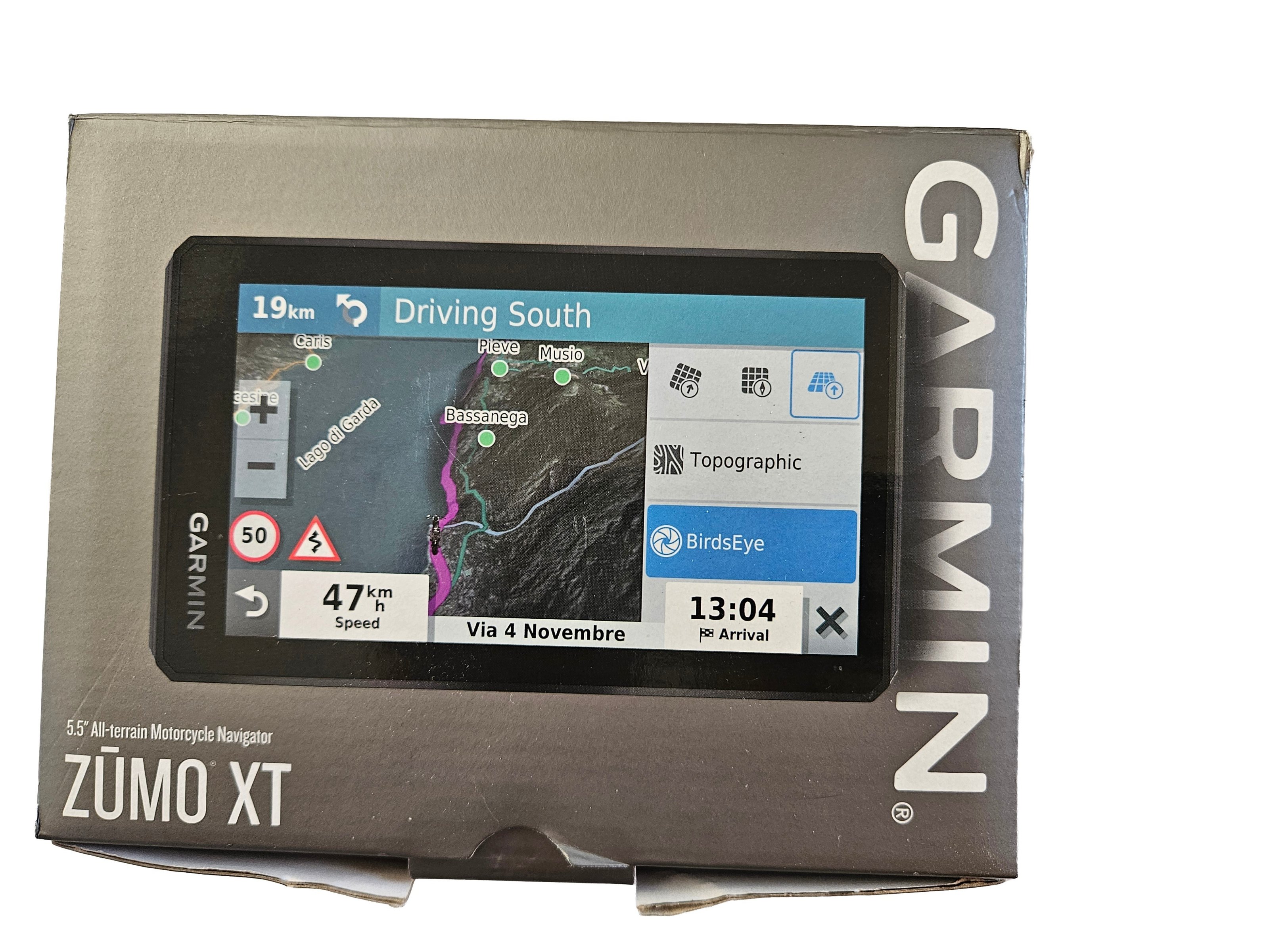 Befestigungsmaterial (Ram-Mount) ist komplett vorhanden, sowie eine Saugnapf-Halterung für eine KFZ Windschutzscheibe mit Ladeadapter für die 12V KFZ-Steckdose. Das Gerät kann somit wahlweise am Bike oder im PKW genutzt werden.