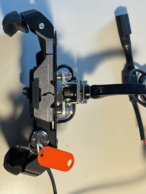 Umgebaut von 12 mm Halteschelle auf BMW Cradle Rohrverschraubung mit Exzenter-Spanner für leichte Einstellung des gewünschten Neigungswinkels und passend für den Rohrdurchmesser des BWM Navi-Halterbügels,