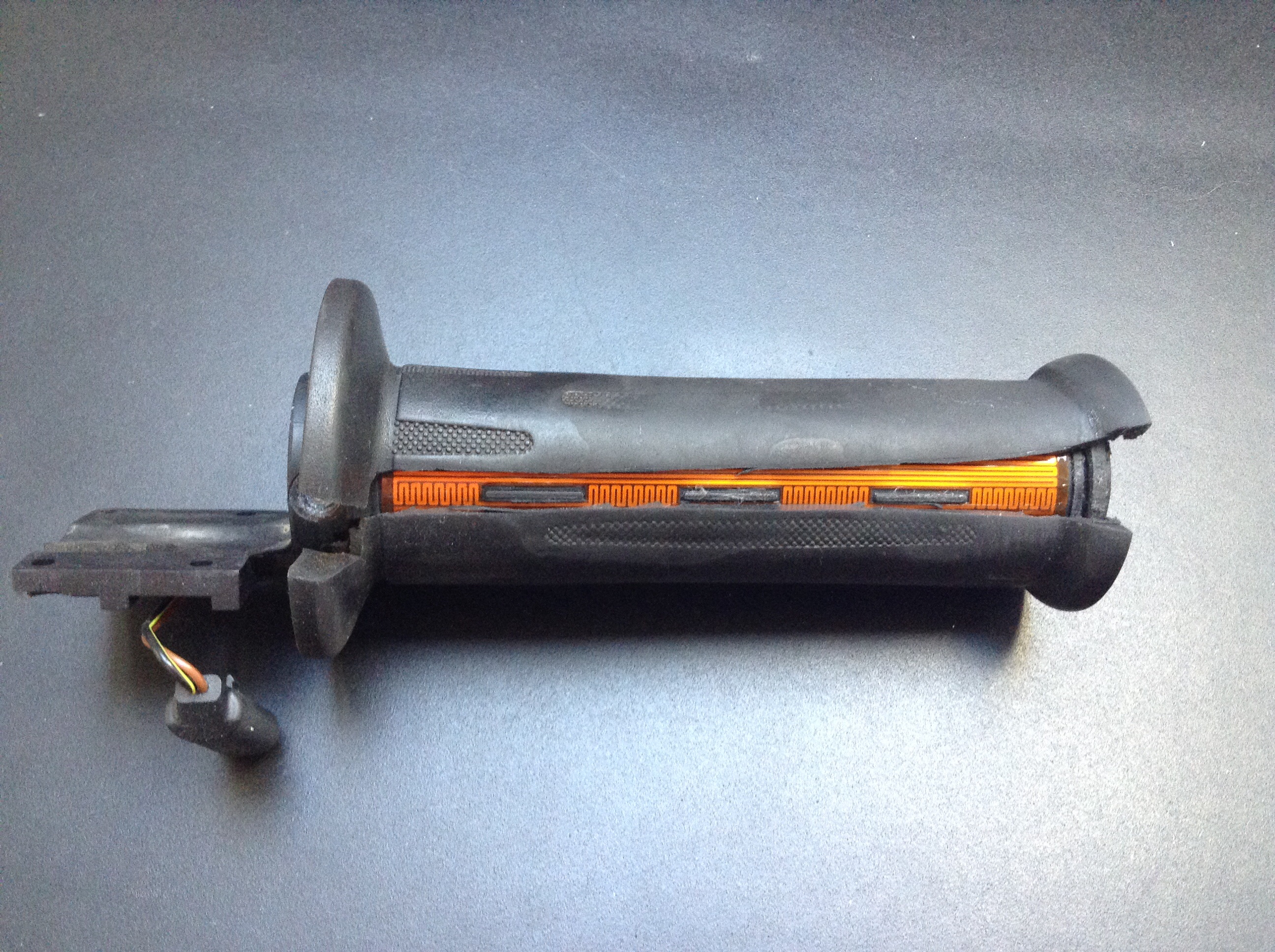 ,Die Griffheizung an meiner MÜ waren nicht mehr als Heizdrähte im Gummi eingebettet, sondern auf einer Folie darunter aufgebracht. Das sah dann so aus...