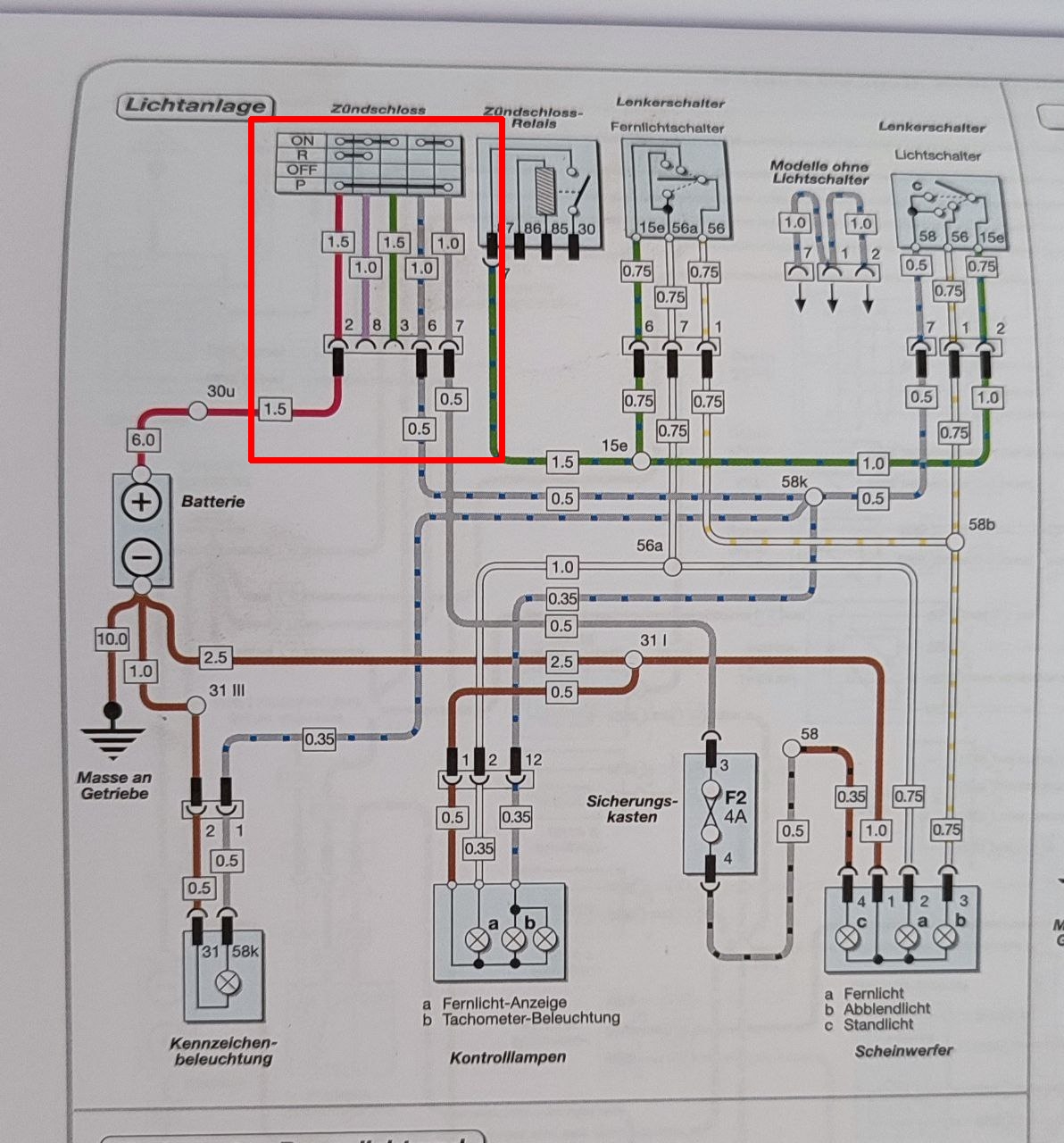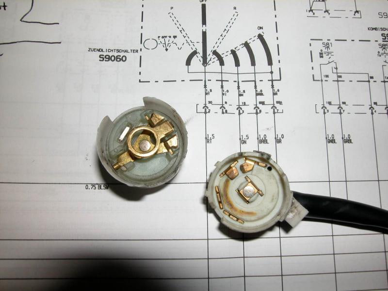 Im eingebauten Zustand funktioniert fast immer das Parklicht (manchmal auch nicht .. ich weiß, klingt nach Kabelbruch. Aber 1. hat der Schalter vor dem Ausbau wg. Lenkschloss-Tausch noch funktioniert und 2. hab ich nicht rausgefunden, wie genau ich den Durchgang prüfe), ON - Stellung ohne Funktion (kein Muks und kein Licht).