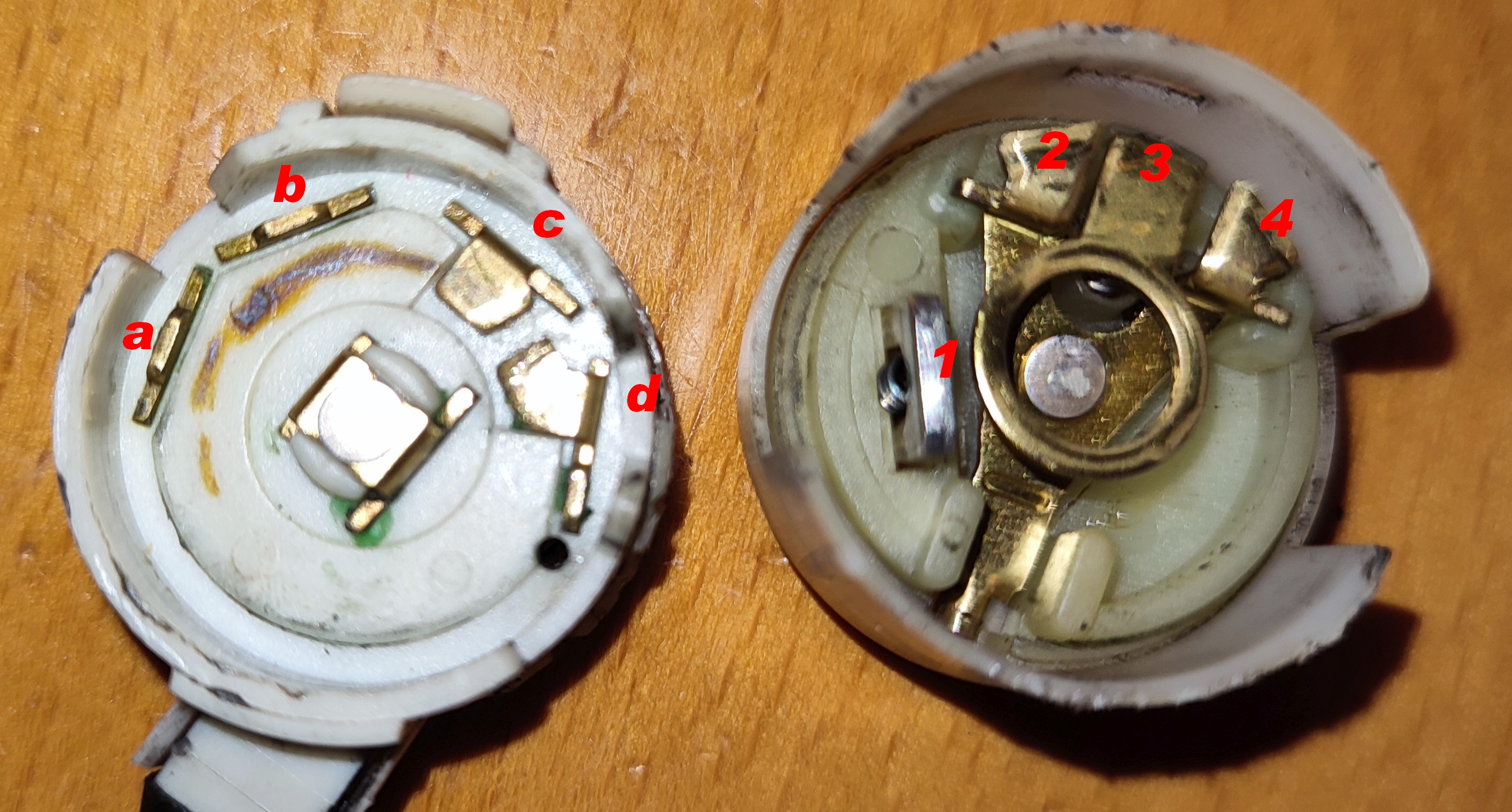 Könnte es an den Kontakten liegen? Als ich den Schalter aufgemacht hab war der rausnehmbare Kontakt (im Bild Nr. 1) nicht an seinem Platz. Hab alle Kontakte mit Bremsenreiniger sauber gemacht, Schalter zusammen- und eingebaut.