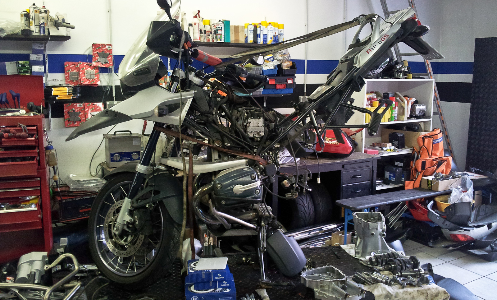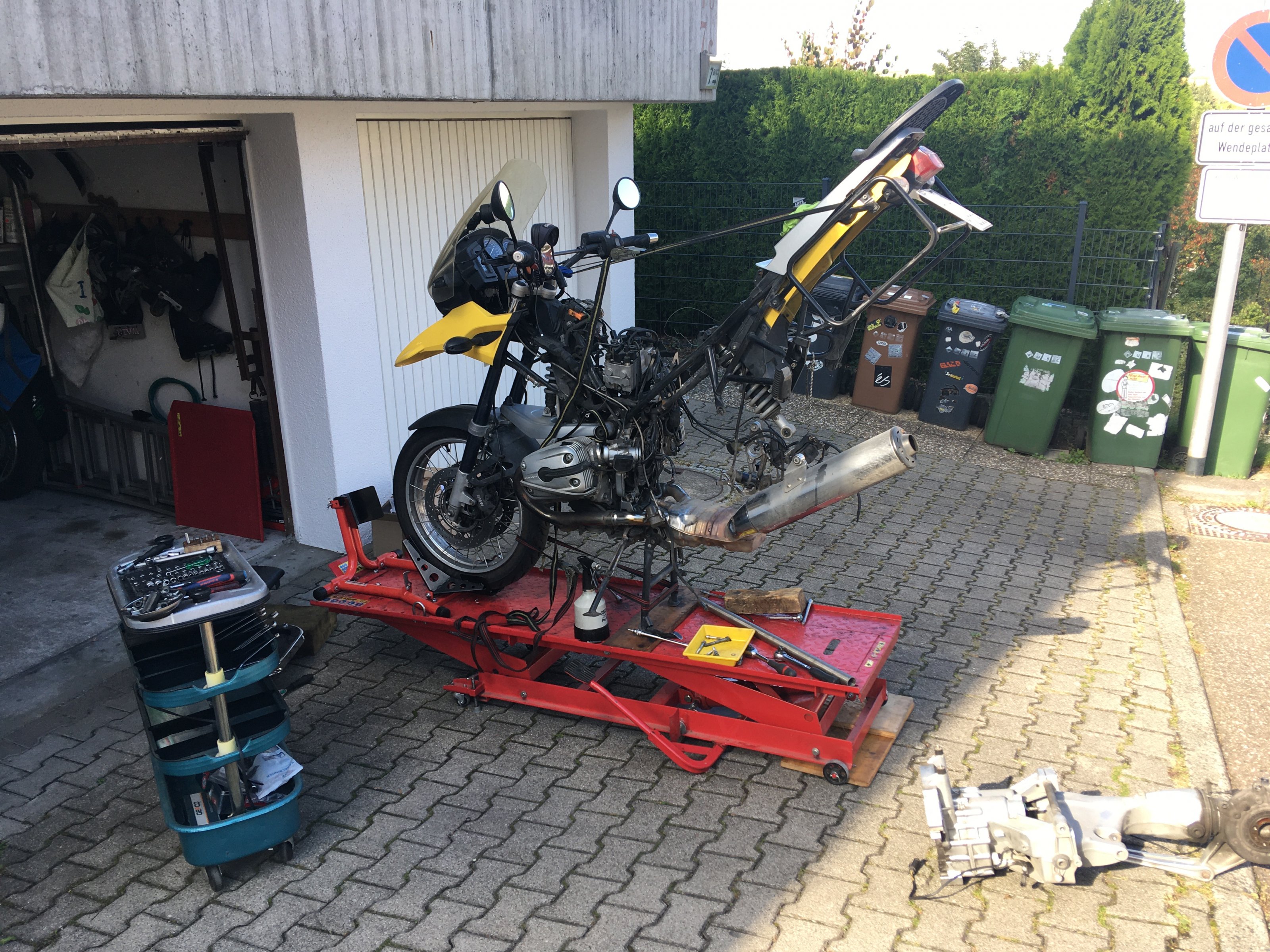 mein Getriebe hatte ein mahlendes Geräusch. Im Leerlauf gut zu hören, sobald ich die Kupplung ziehe, war es weg. Innerhalb von vier Wochen wurde es lauter. Anfang Okt. besuchte mit Klaus (Klausmong) und er meinte auch, Lagerschaden, der sich ankündigt. OK, dann lieber machen als fahren bis kaputt. Und auch beschlsosen, ich baue das Getriebe selber aus. Handbuch liegt vor, bissl Schrauberei traue ich mir auch zu. Rest wird sich zeigen, bzw. könnt Ihr mir gern mit Rat und Tat zur Seite stehen. Heute also angefangen und Werkstatt bereit gemacht. Vorher